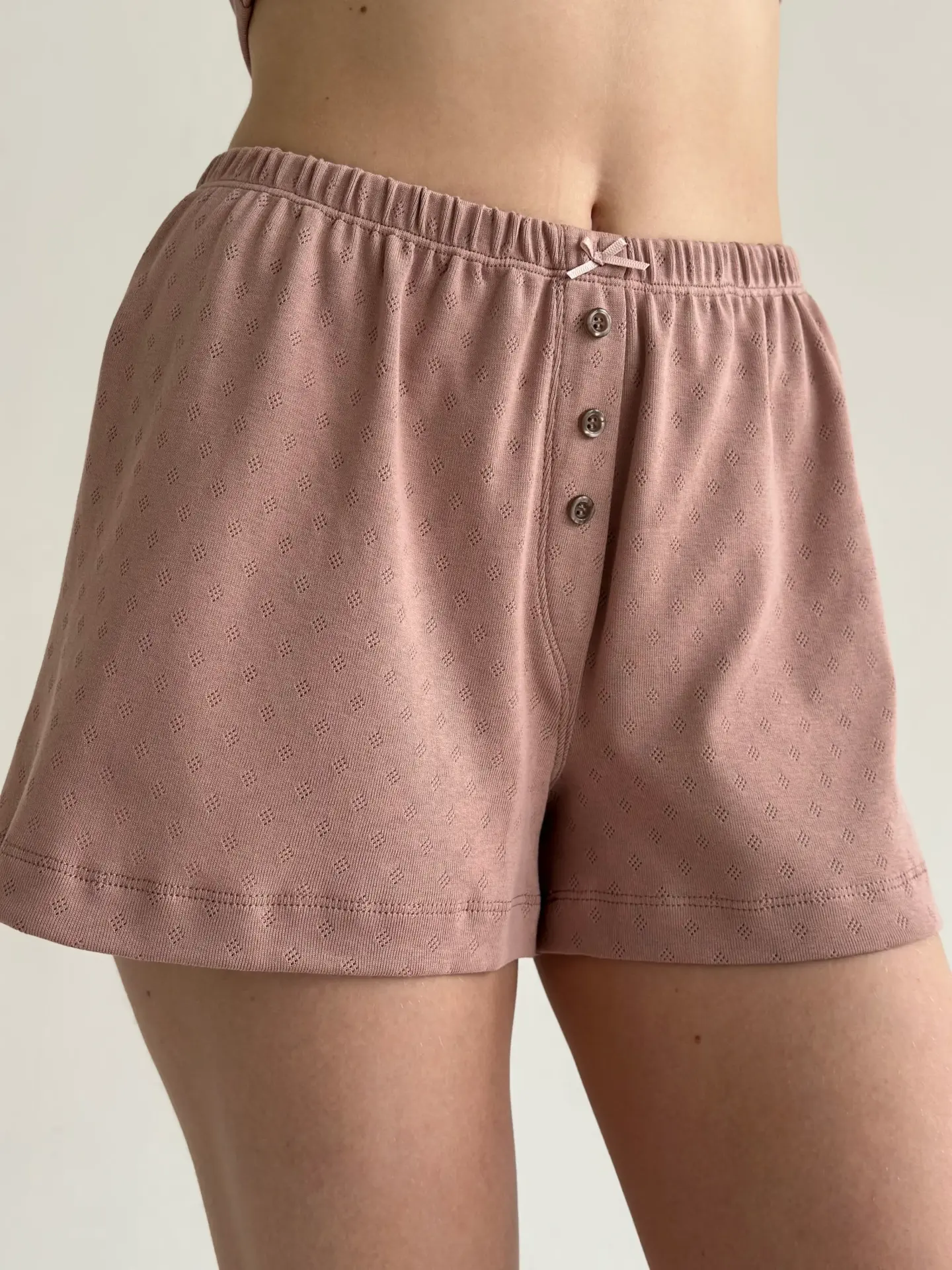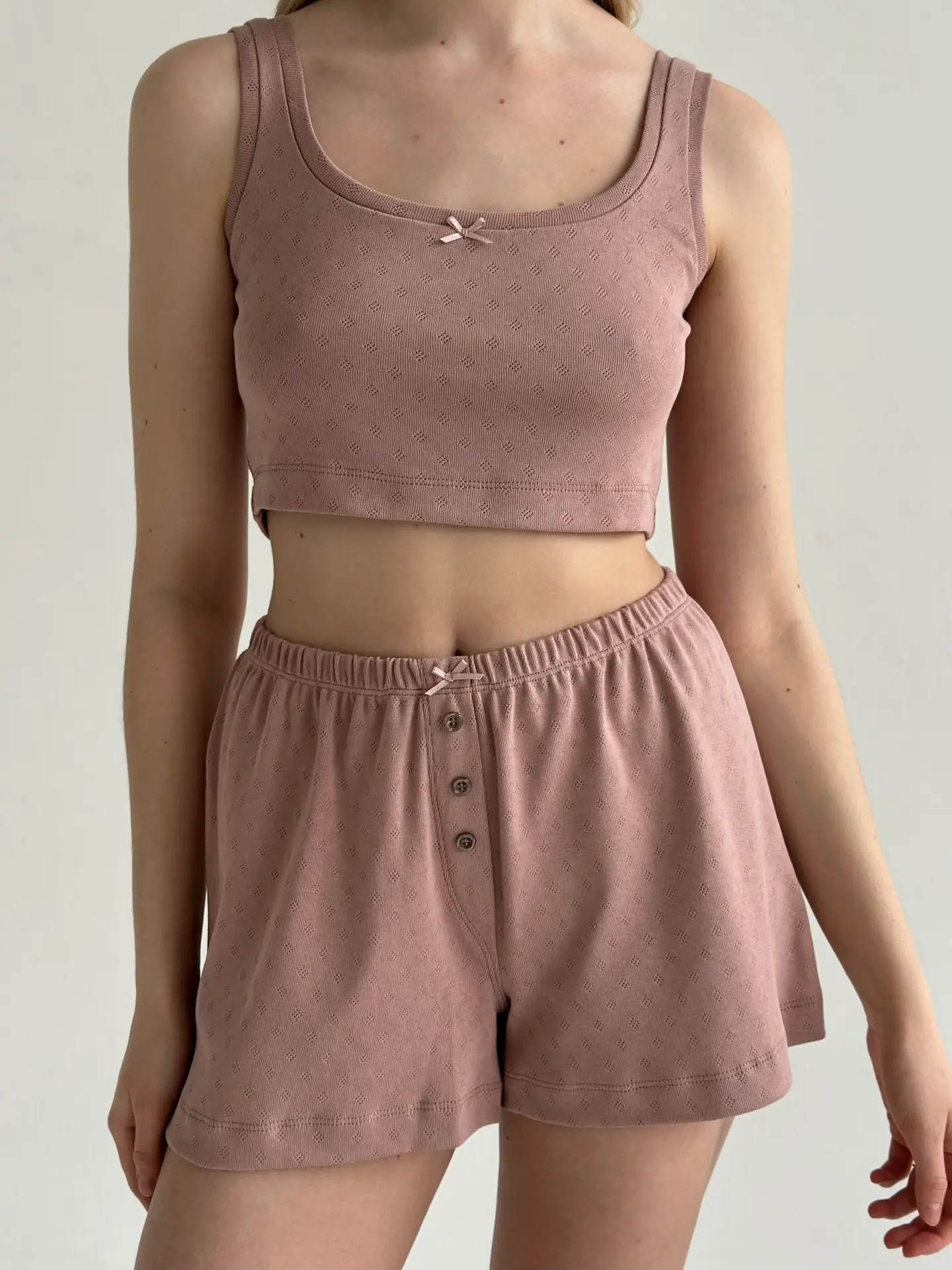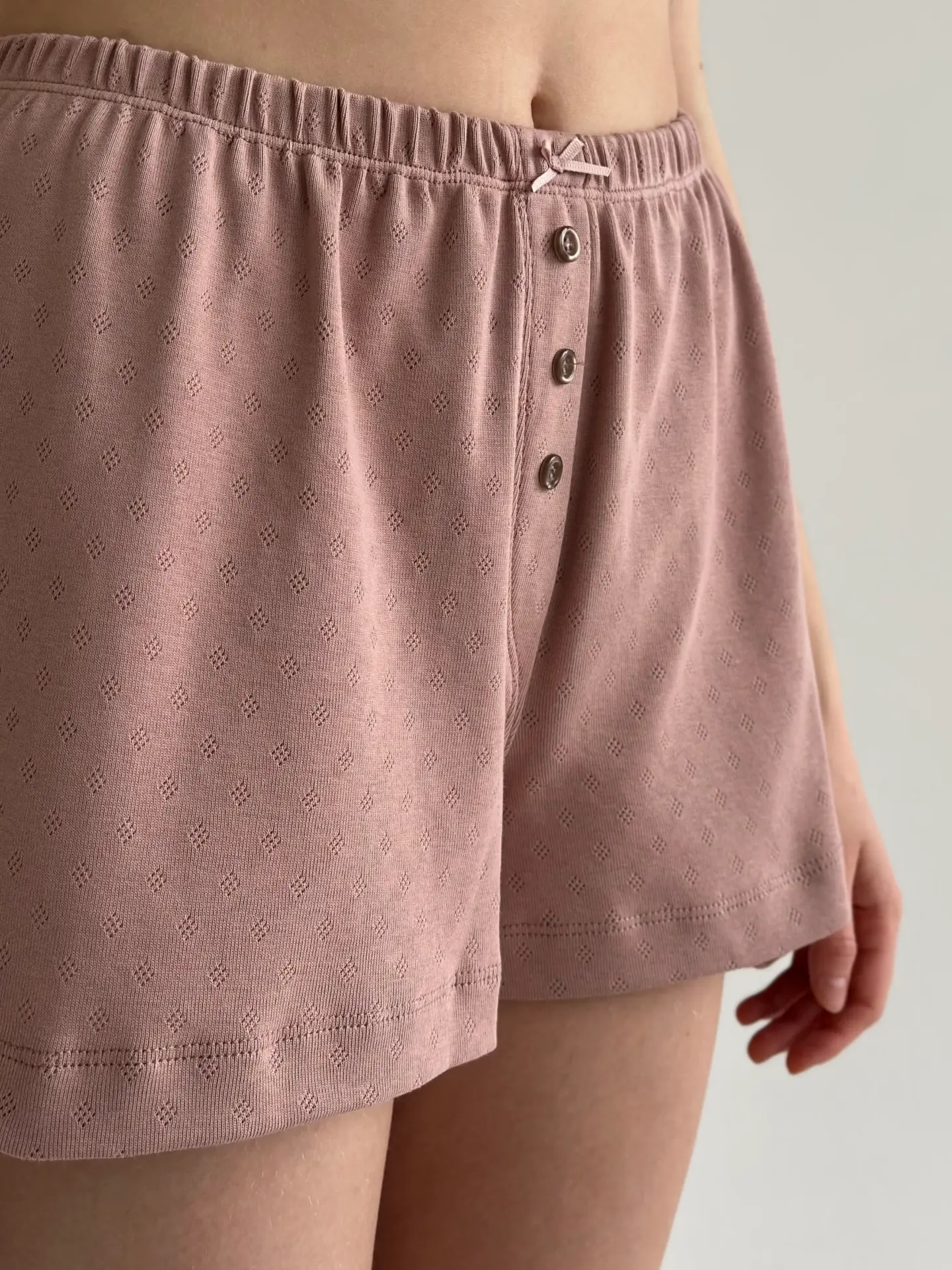 Шорти рібана легкі та комфортні. Завдяки еластичній тканині та вільному крою, вони забезпечують зручність у носінні, а декоративна планка з ґудзиками додає витонченості. Ідеальний вибір для дому або як частина стильного повсякденного комплекту.