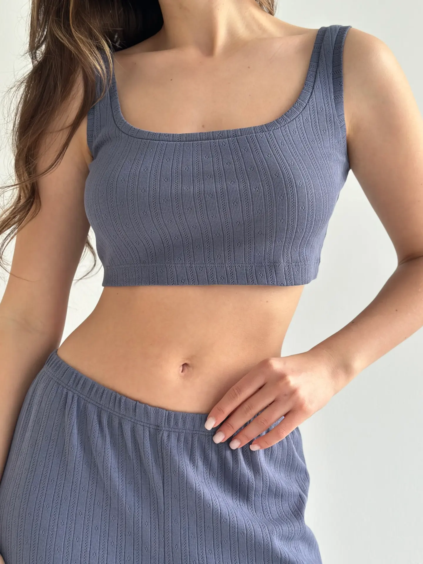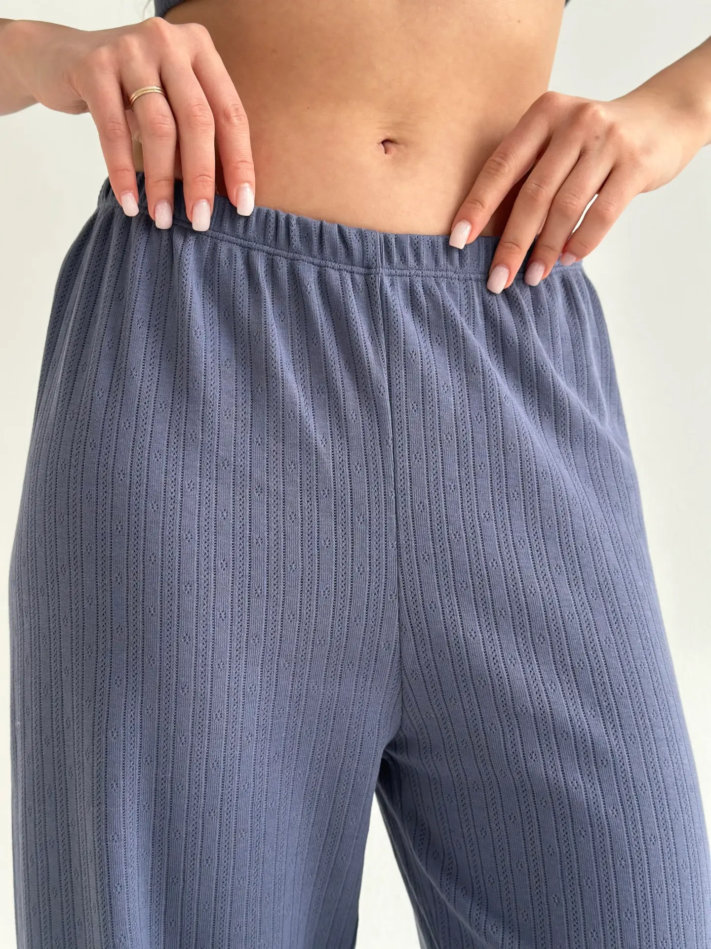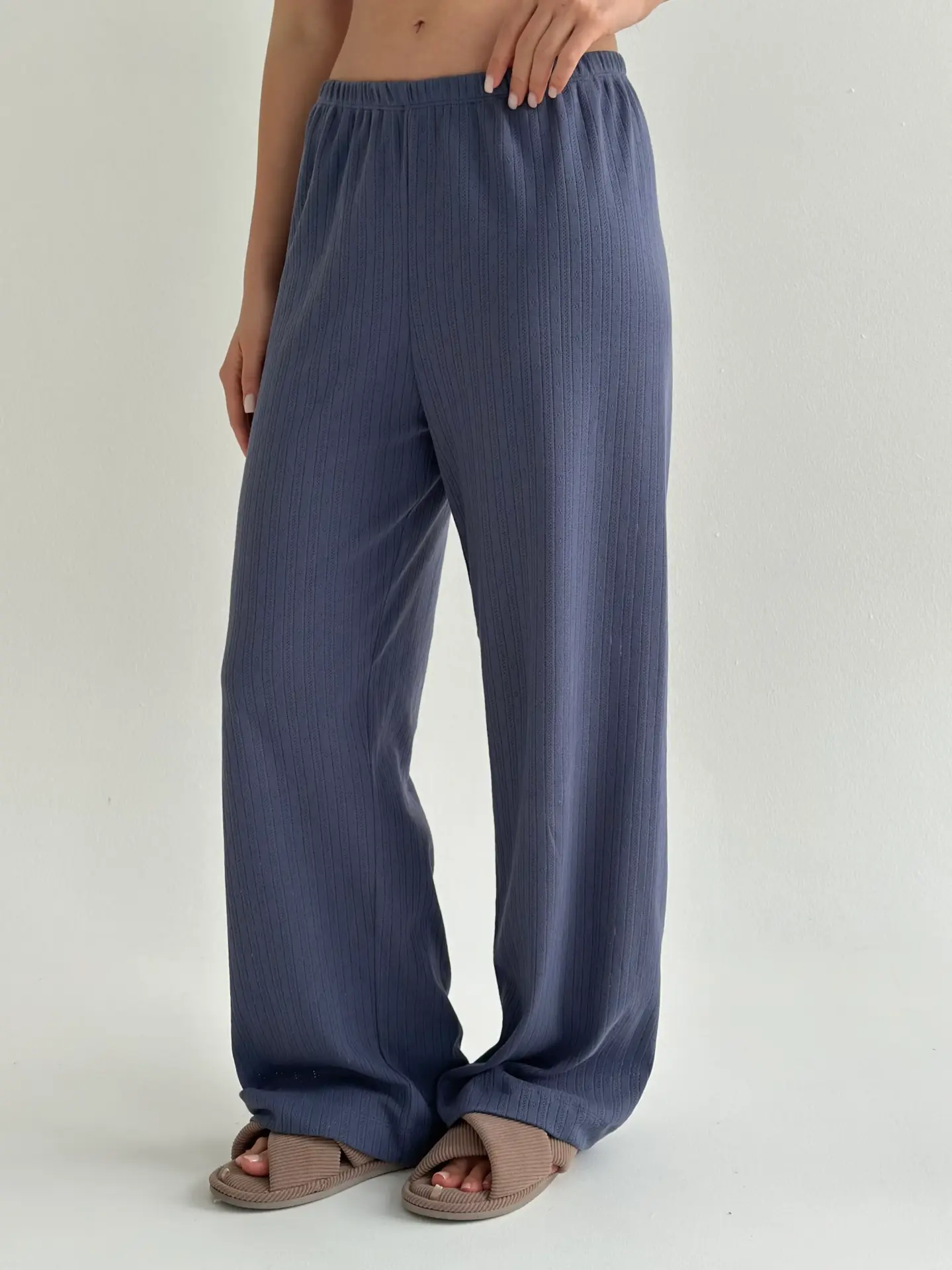 Комфортні та стильні широкі штани з рібани. М’який, дихаючий матеріал забезпечує зручність у носінні. Ідеальні як для дому, так і для комфортного сну.
