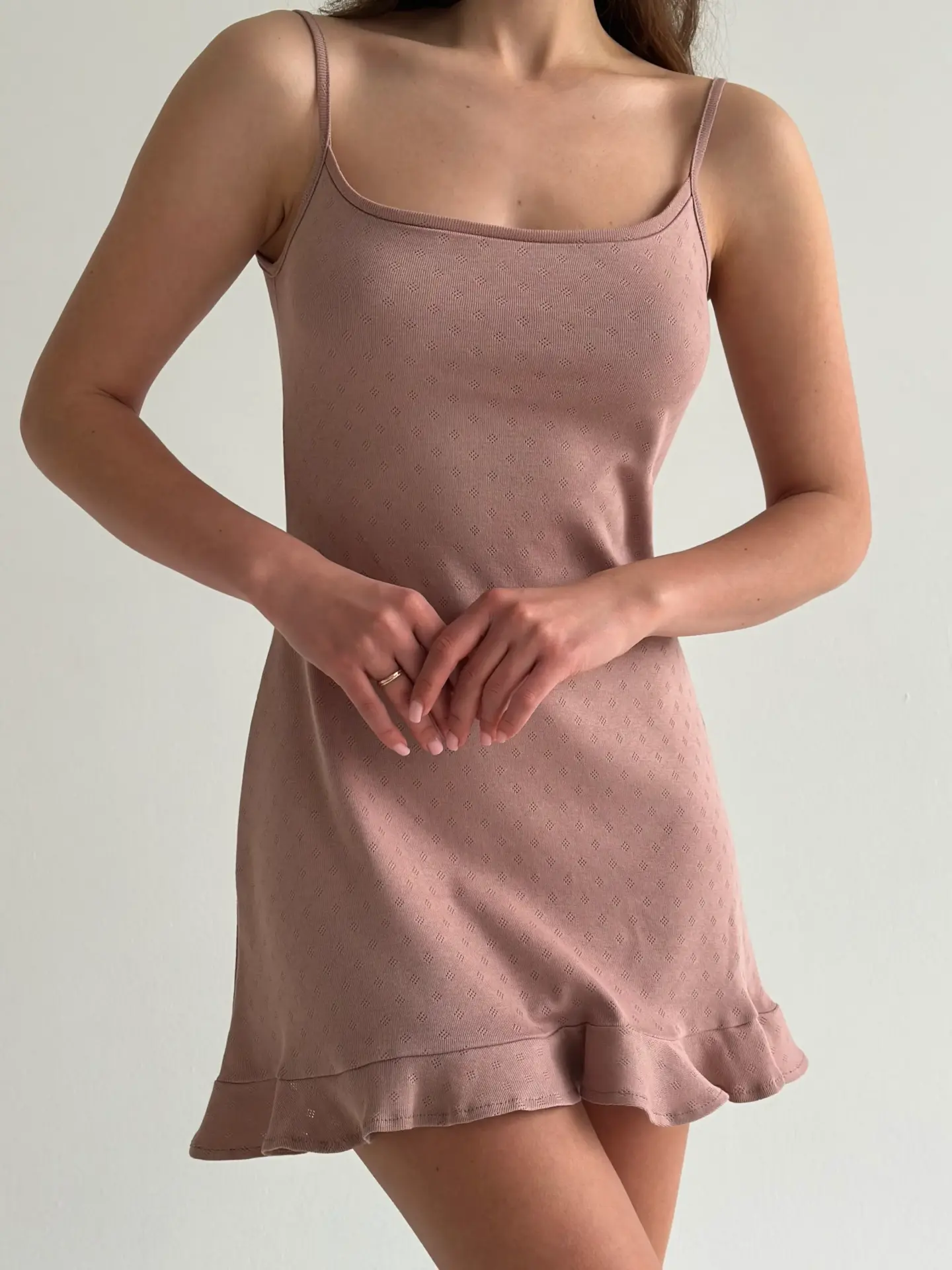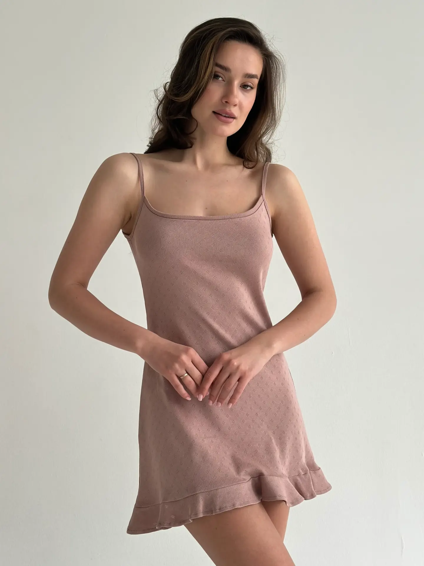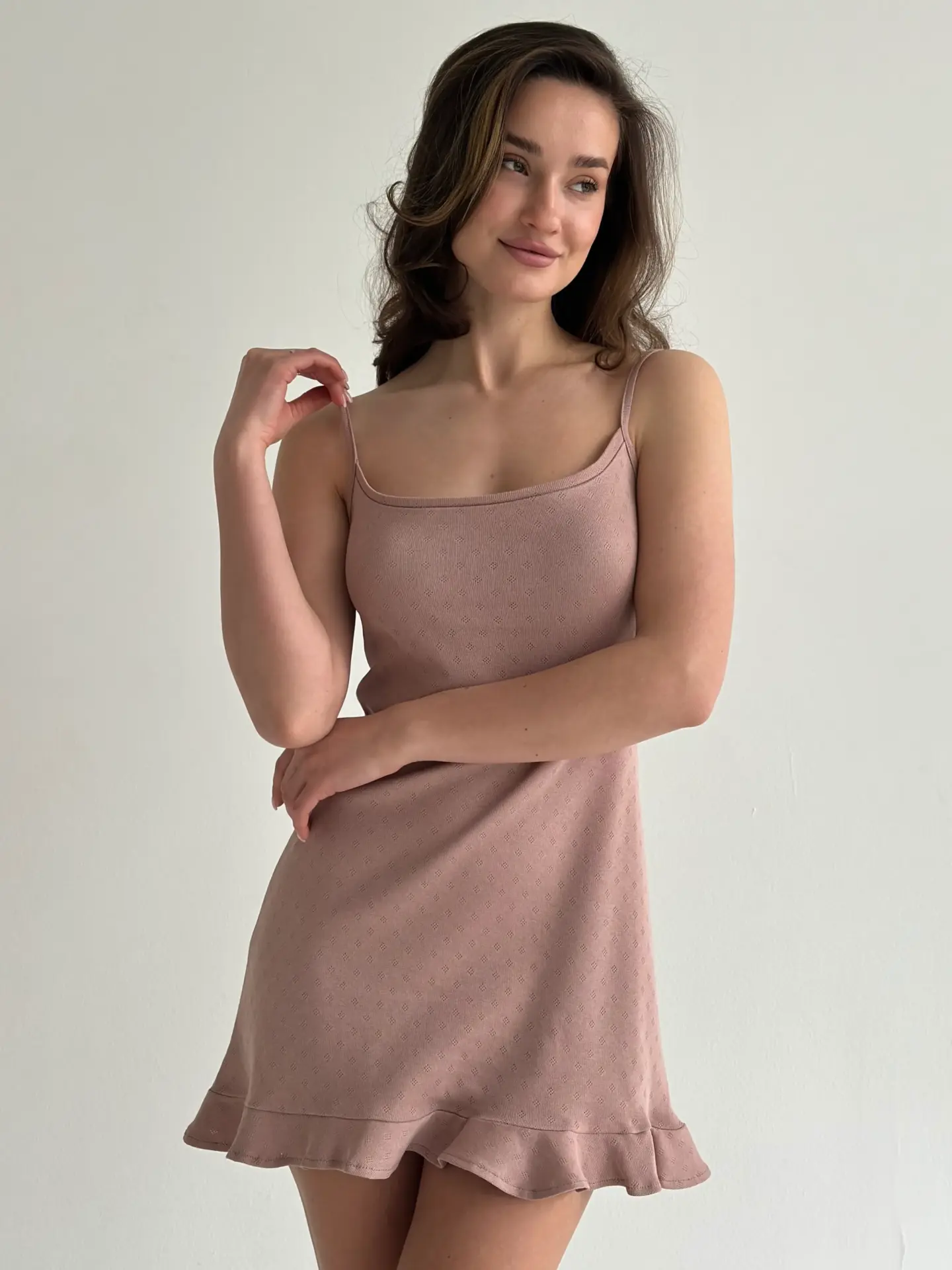 Сукня для сну з рібани з оборками – ідеальний вибір для домашнього затишку. М’яка еластична тканина забезпечує комфорт і свободу рухів, а ніжні оборки додають жіночності та витонченості. Стильний і практичний варіант для вашого нічного гардероба.