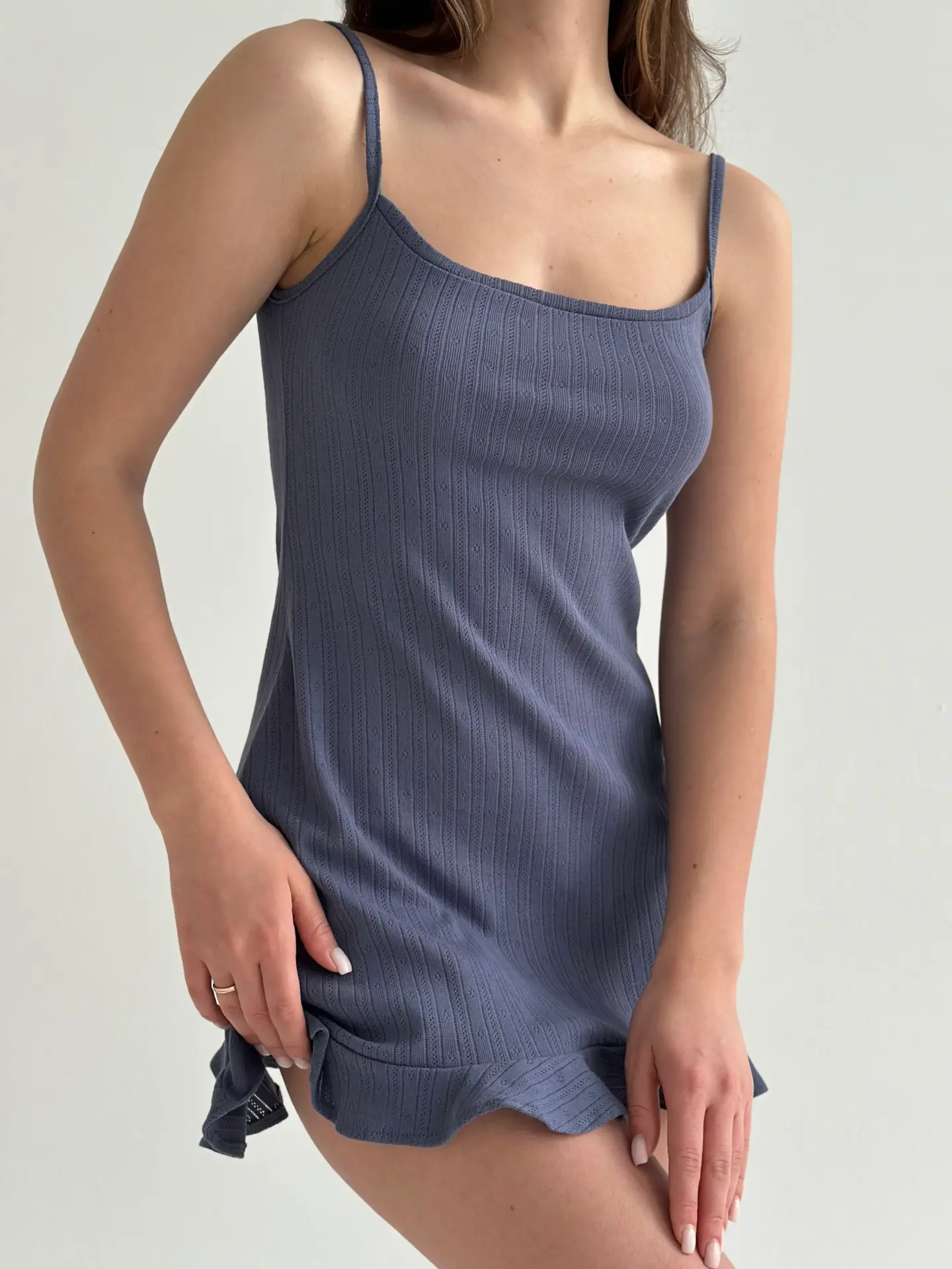 Сукня для сну з рібани з оборками – ідеальний вибір для домашнього затишку. М’яка еластична тканина забезпечує комфорт і свободу рухів, а ніжні оборки додають жіночності та витонченості. Стильний і практичний варіант для вашого нічного гардероба.