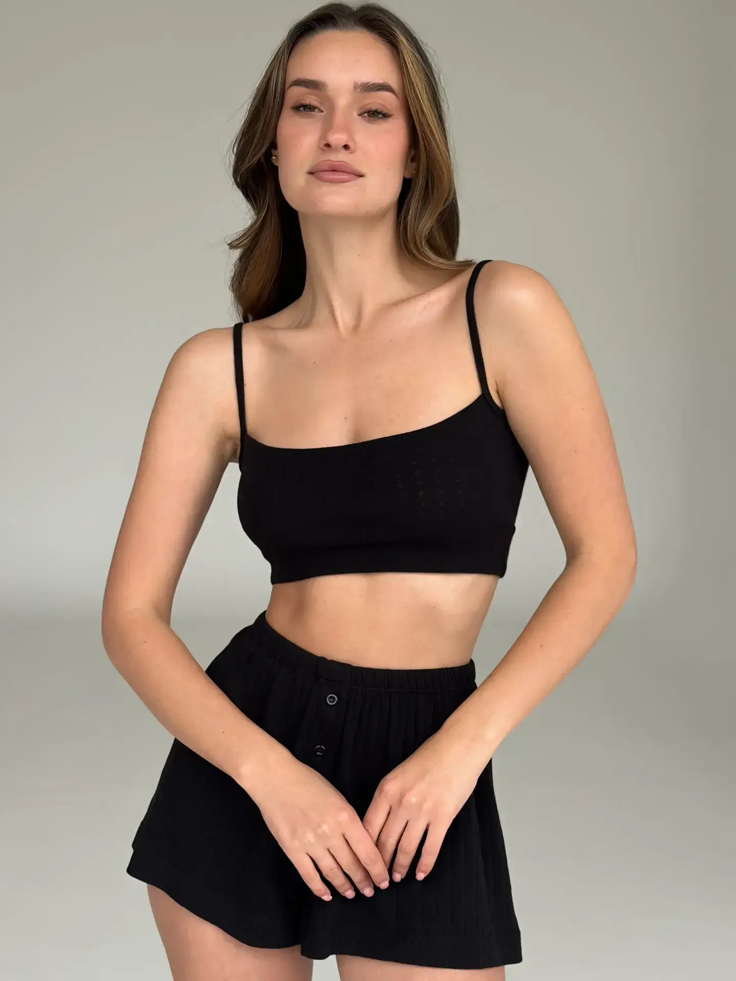 Рібана топ на бретелях поєднує комфорт і мінімалістичний стиль. Еластична тканина приємно прилягає до тіла, забезпечуючи зручність і свободу рухів. Ідеально пасує до домашніх штанів, шортів або як базовий елемент під улюблений кардиган чи сорочку. Стильний вибір для повсякденних образів і відпочинку.