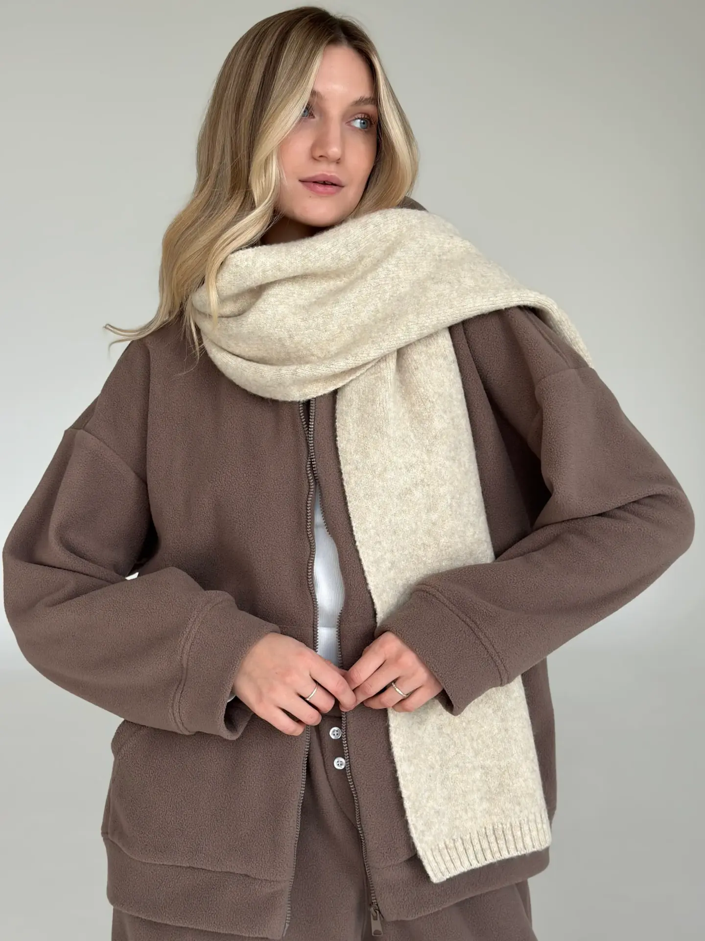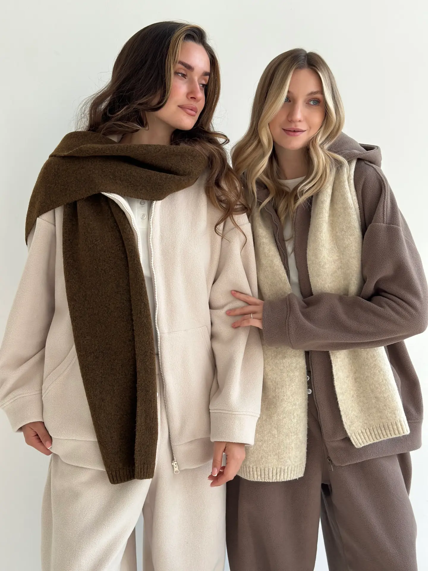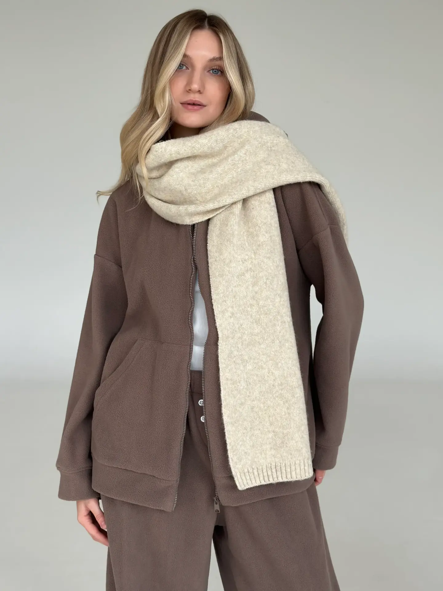 Шарф в’язаний із м’якої, об’ємної пряжі створює відчуття тепла й затишку. Акуратна в’язка та базові відтінки додають образу вишуканості. Ідеальний аксесуар для холодного сезону — легко поєднується з пальто, пуховиком чи светром.