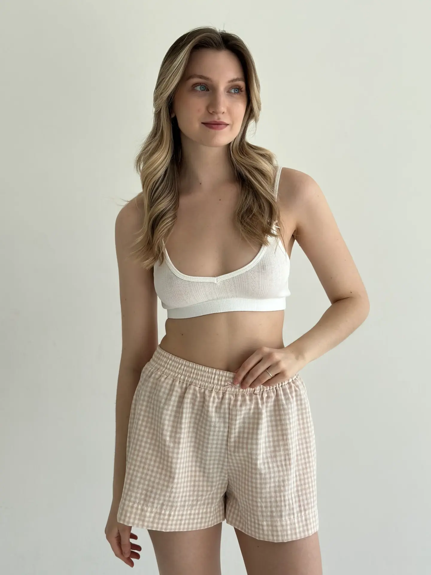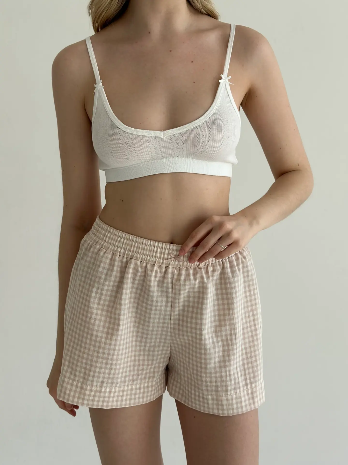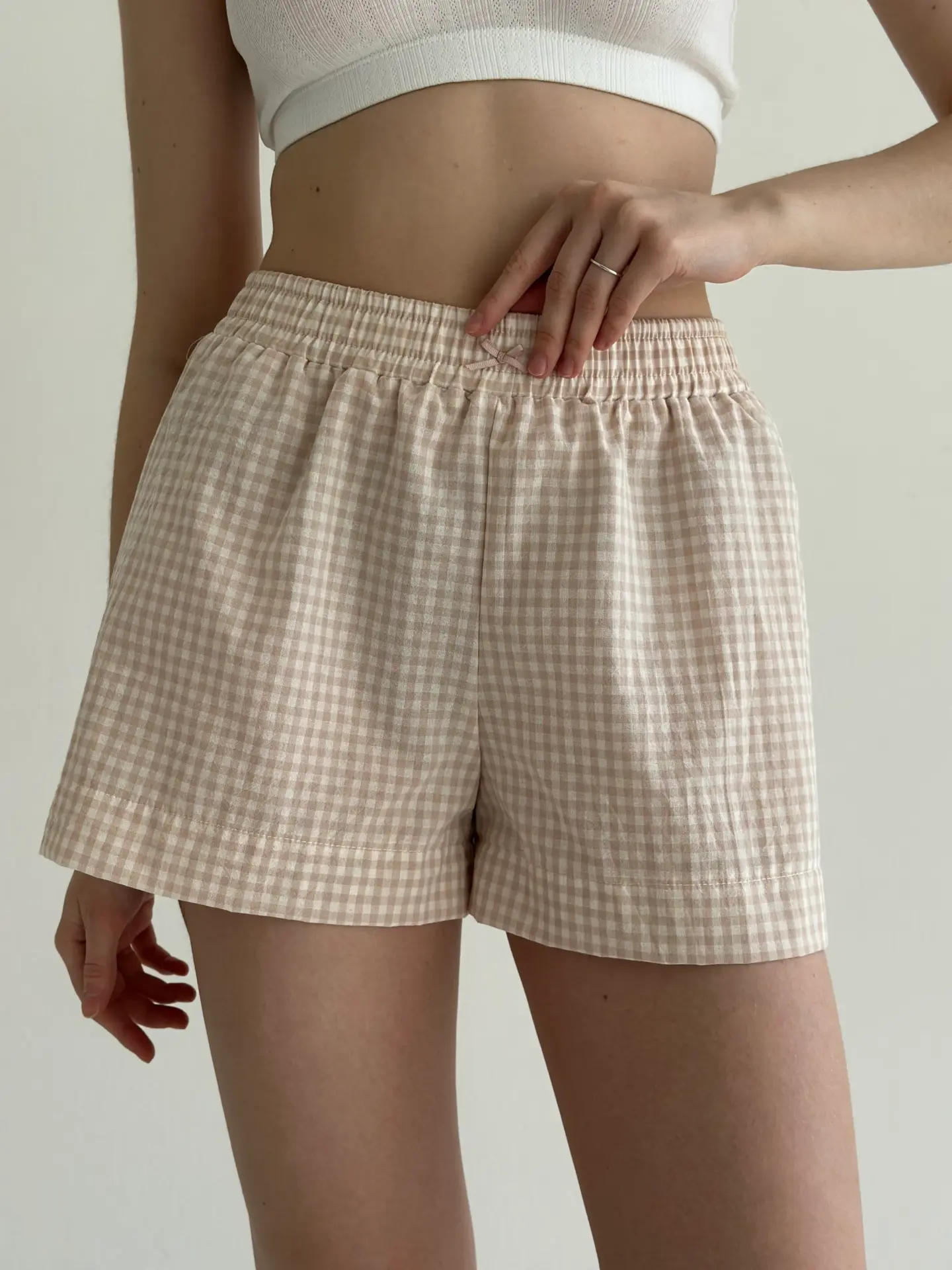 Шорти моно з котону в клітинку поєднують комфорт і лаконічний стиль. Натуральна бавовняна тканина приємна до тіла, добре пропускає повітря та забезпечує зручність упродовж дня. Завдяки простому крою модель ідеально підходить для домашнього відпочинку.