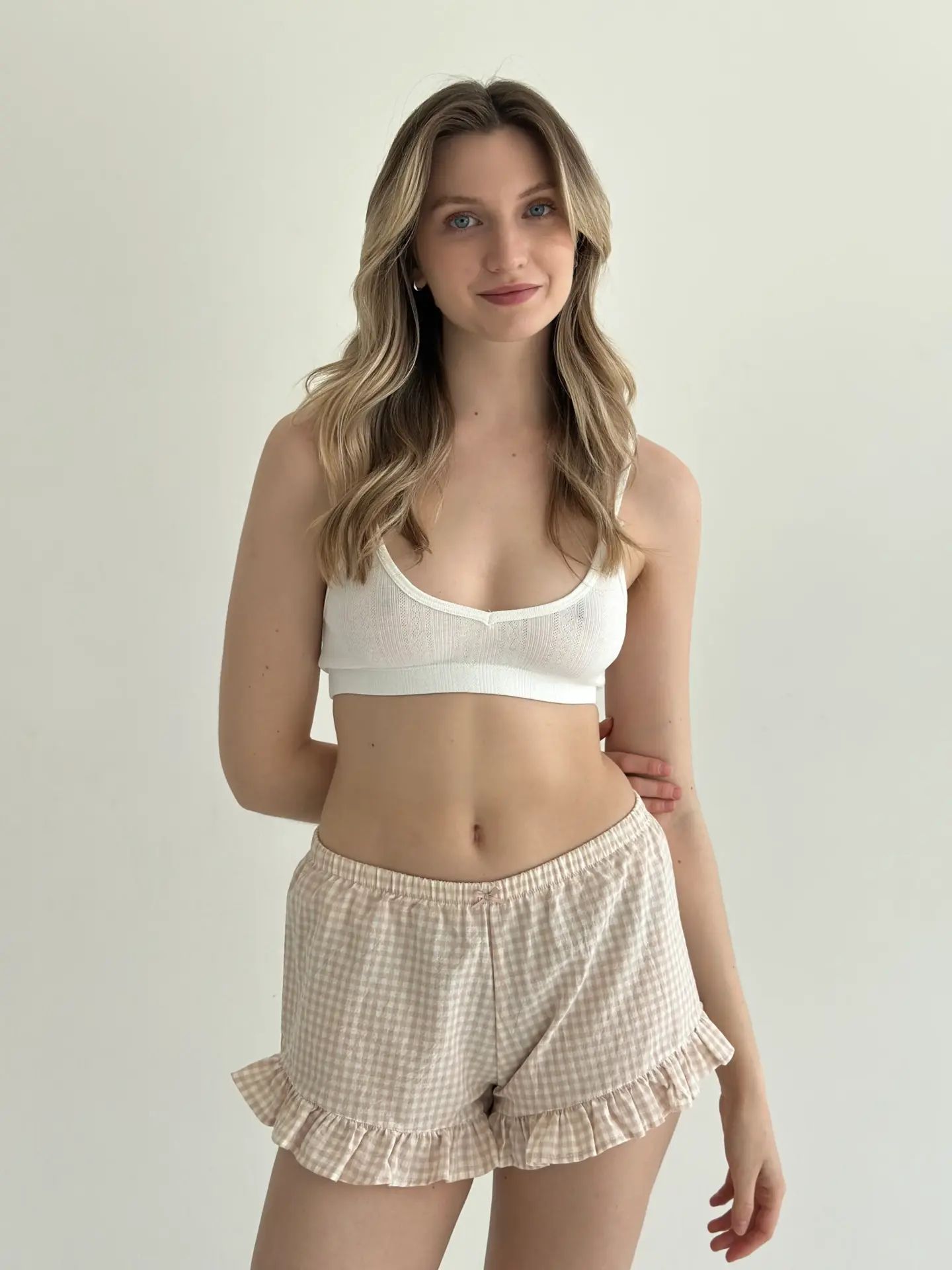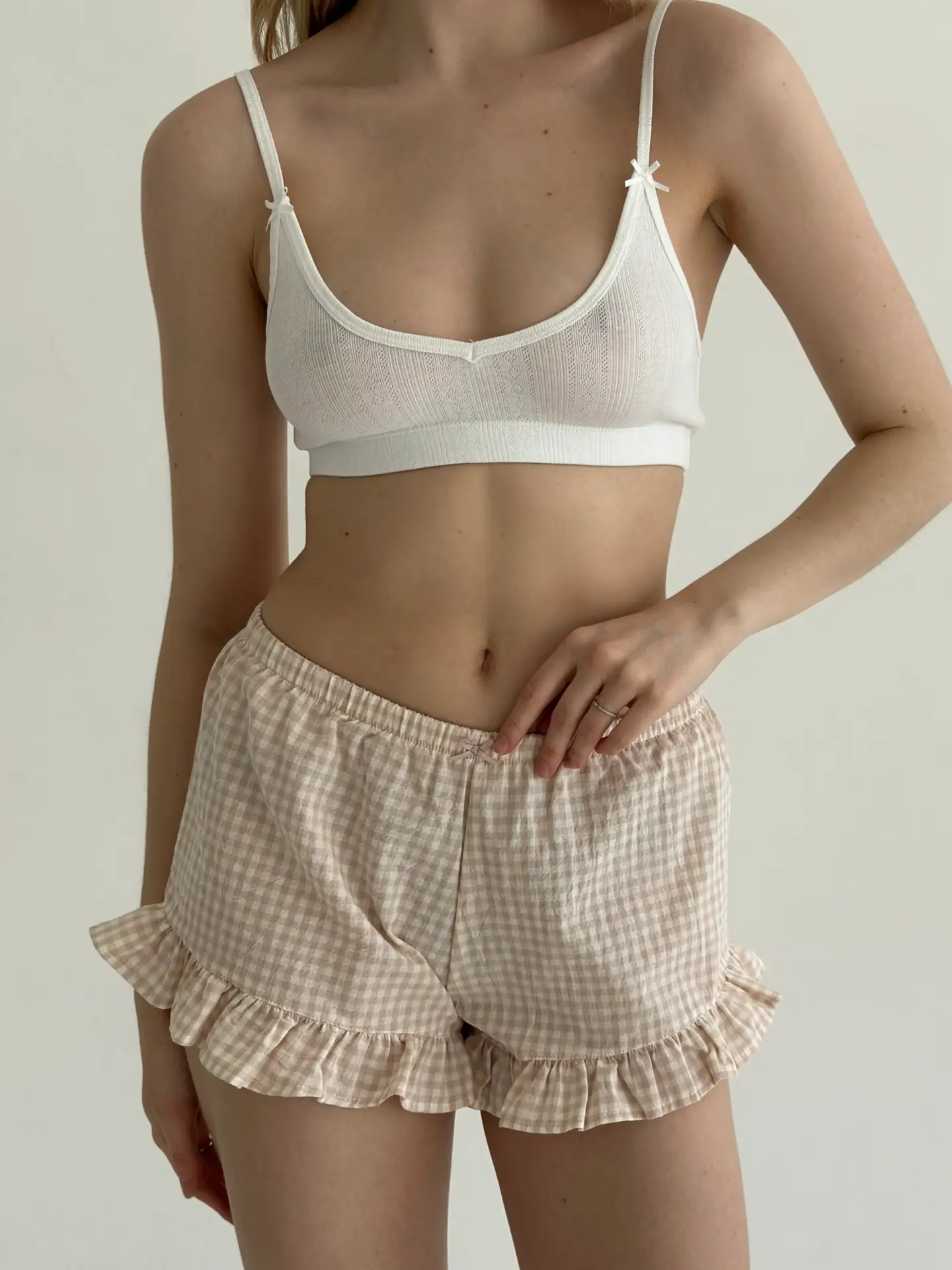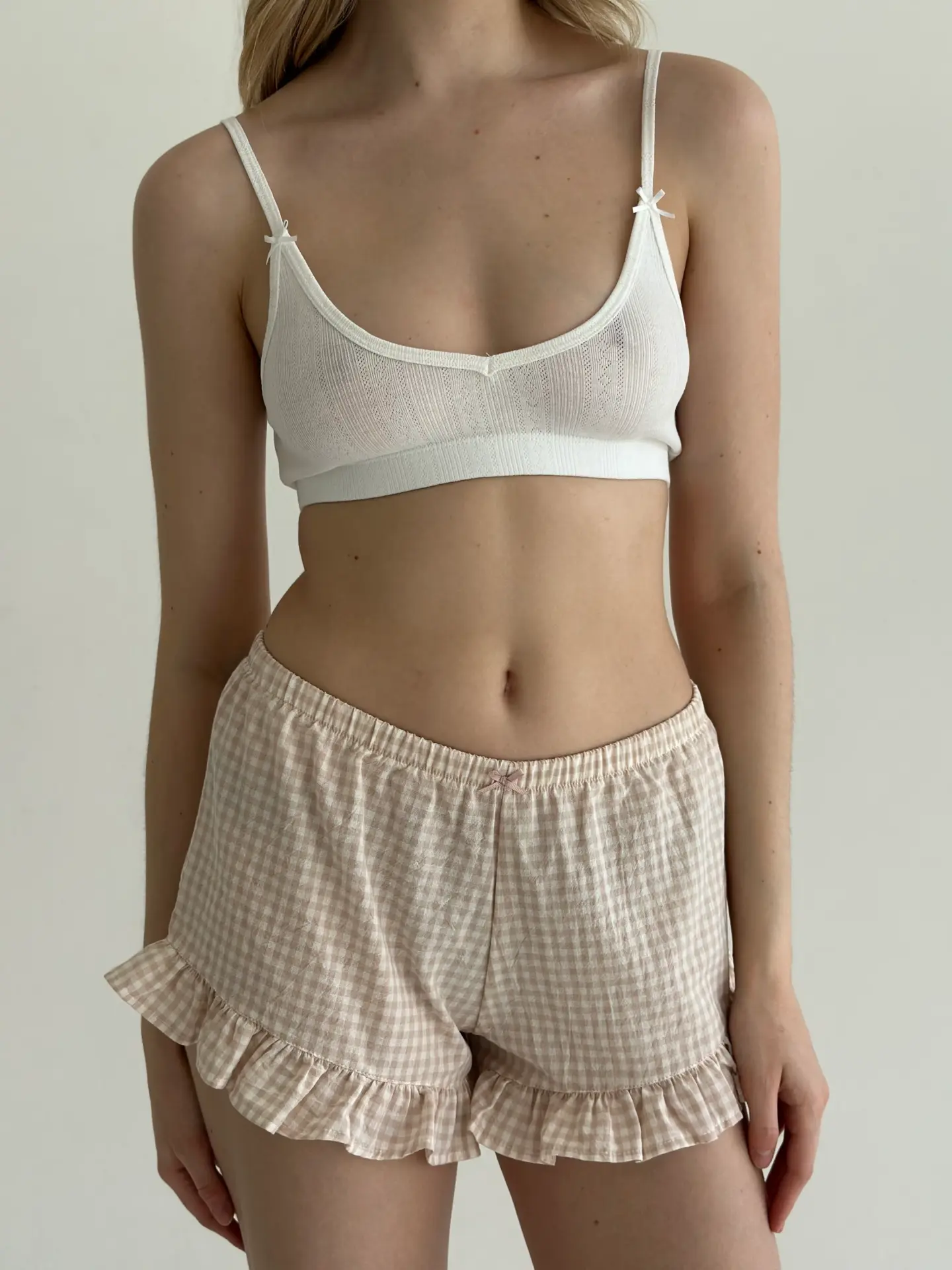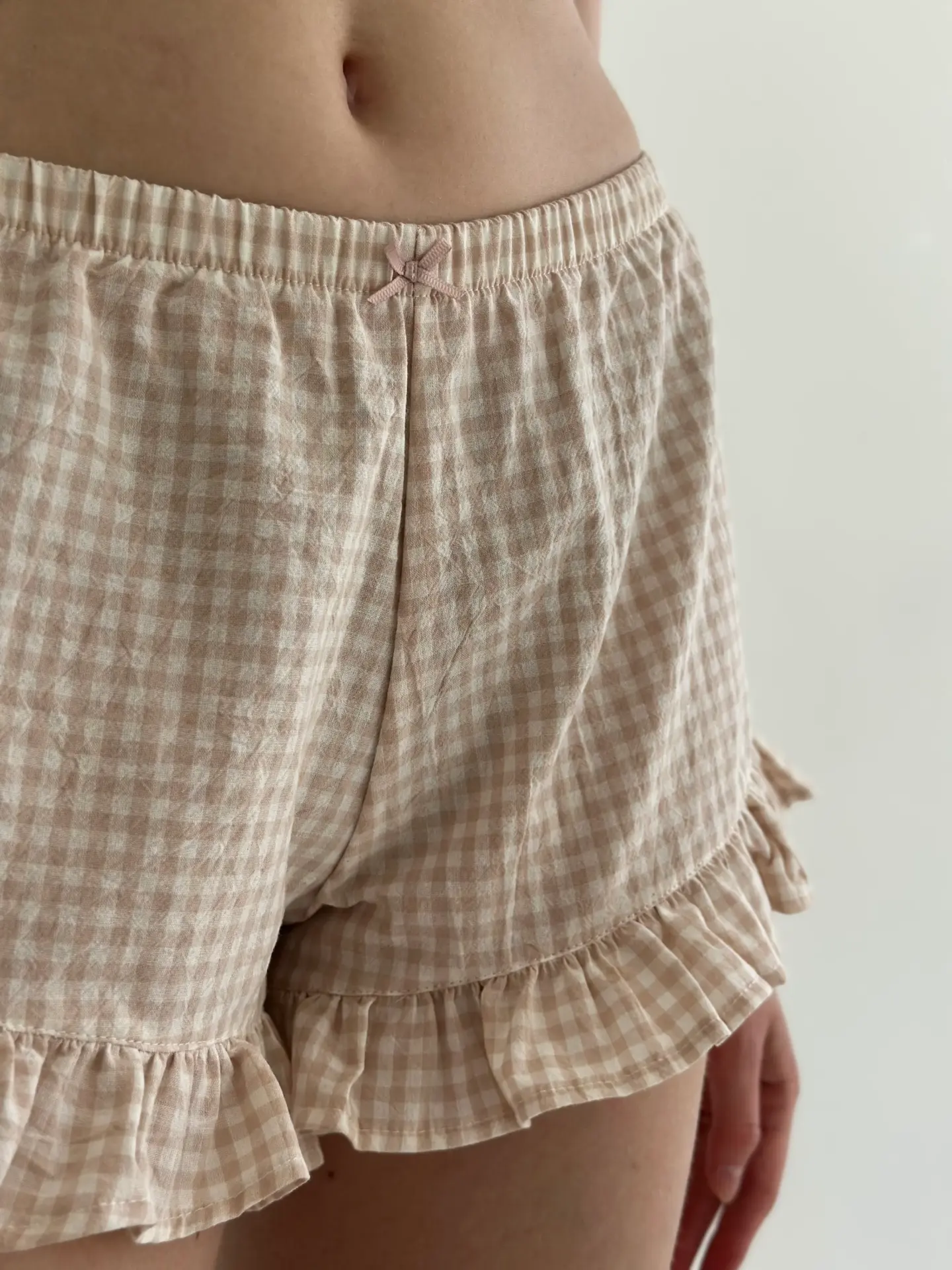 Шорти з котону в клітинку з рюшем поєднують комфорт і ніжний жіночний стиль. Натуральна бавовняна тканина приємна до тіла, добре пропускає повітря та забезпечує зручність упродовж дня. Акуратний рюш додає легкості та робить модель стильним варіантом для домашнього відпочинку.