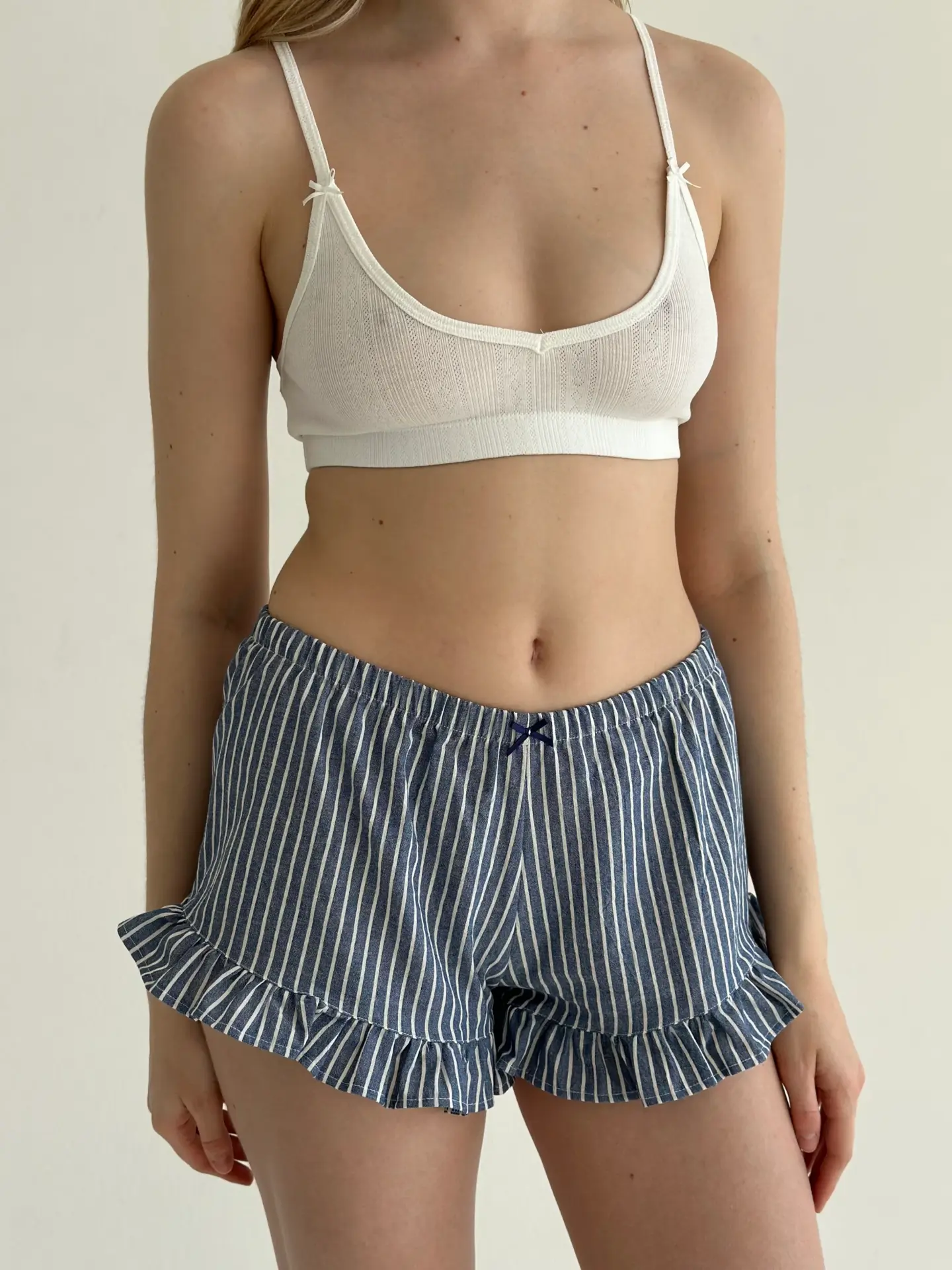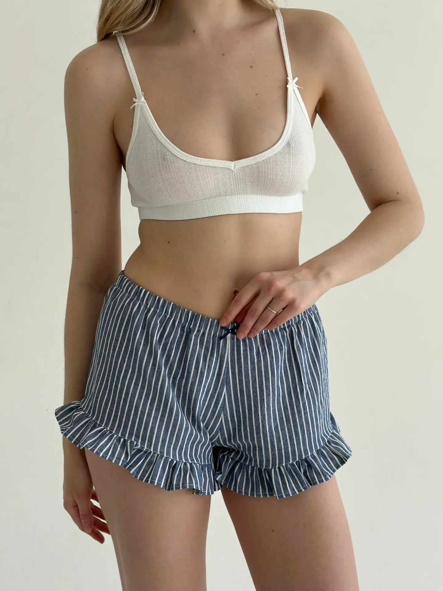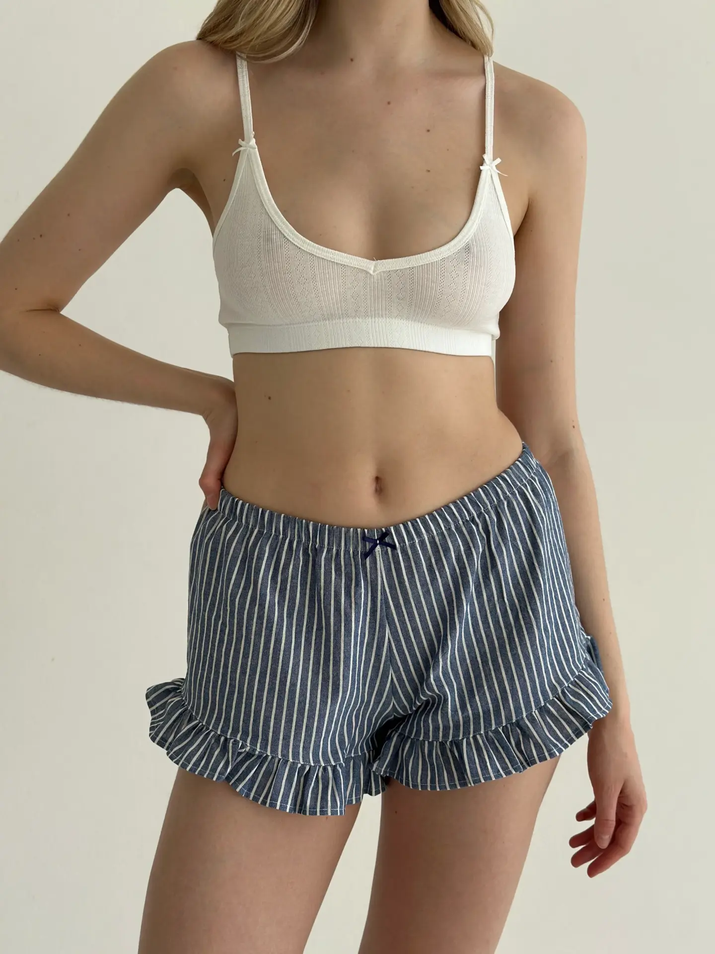 Шорти з котону в смужку з рюшем поєднують комфорт і ніжний жіночний стиль. Натуральна бавовняна тканина приємна до тіла, добре пропускає повітря та забезпечує зручність упродовж дня. Акуратний рюш додає легкості та робить модель стильним варіантом для домашнього відпочинку.