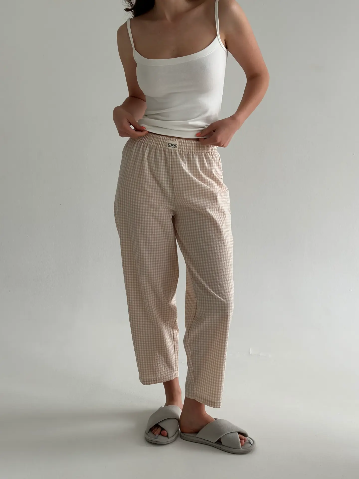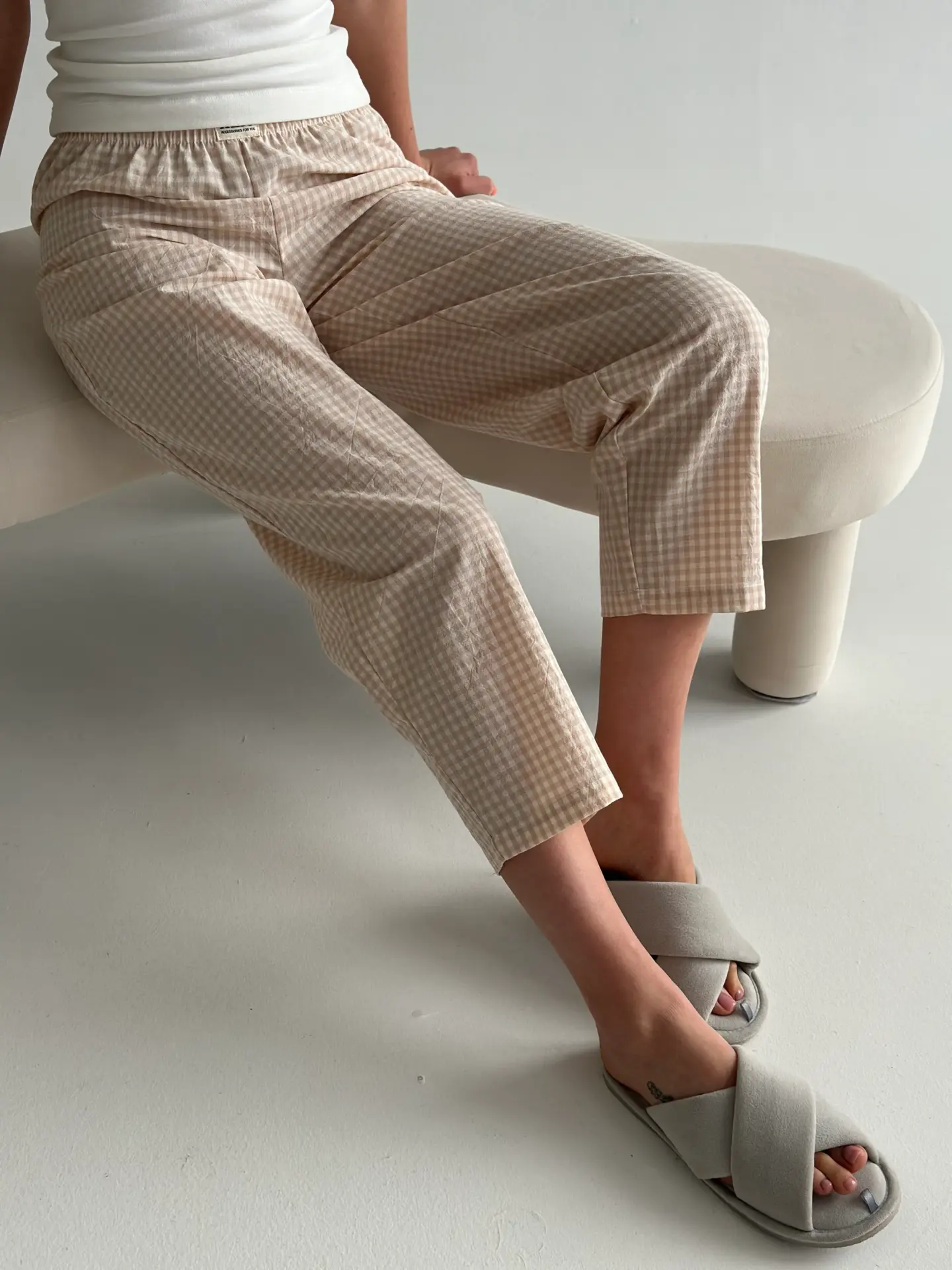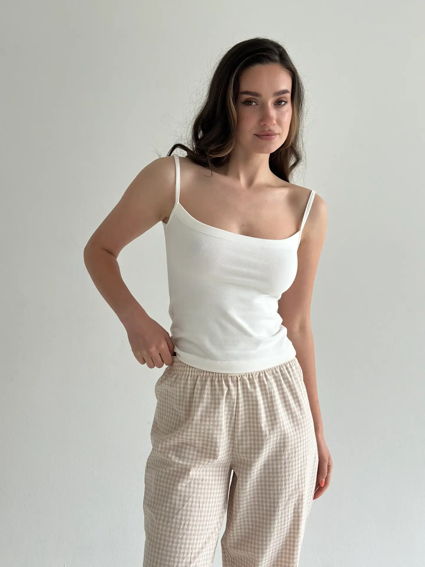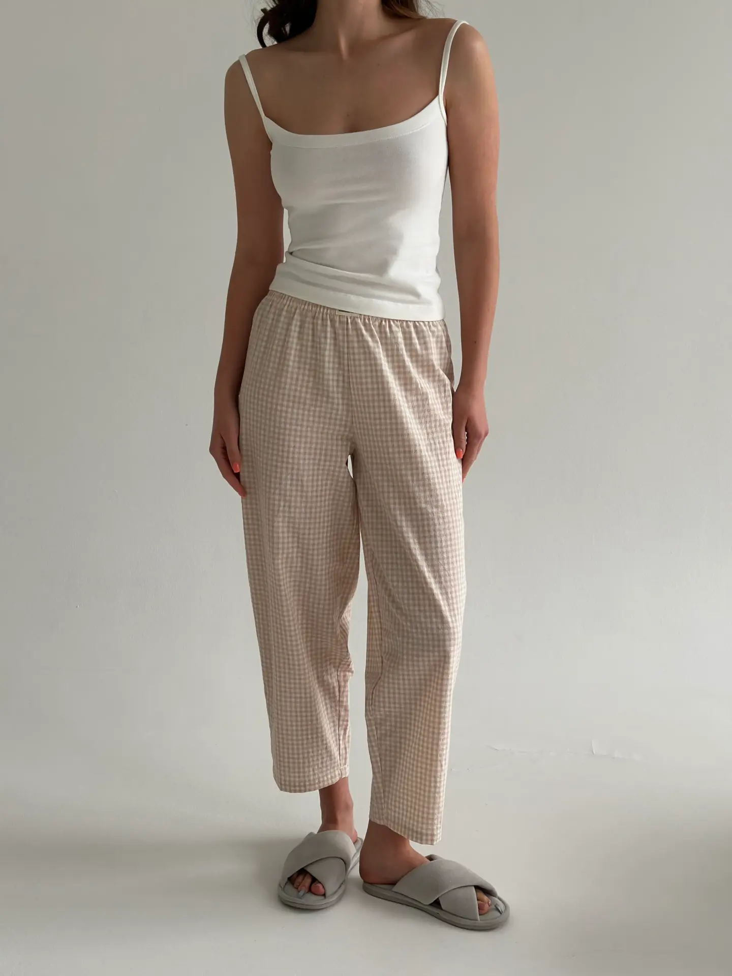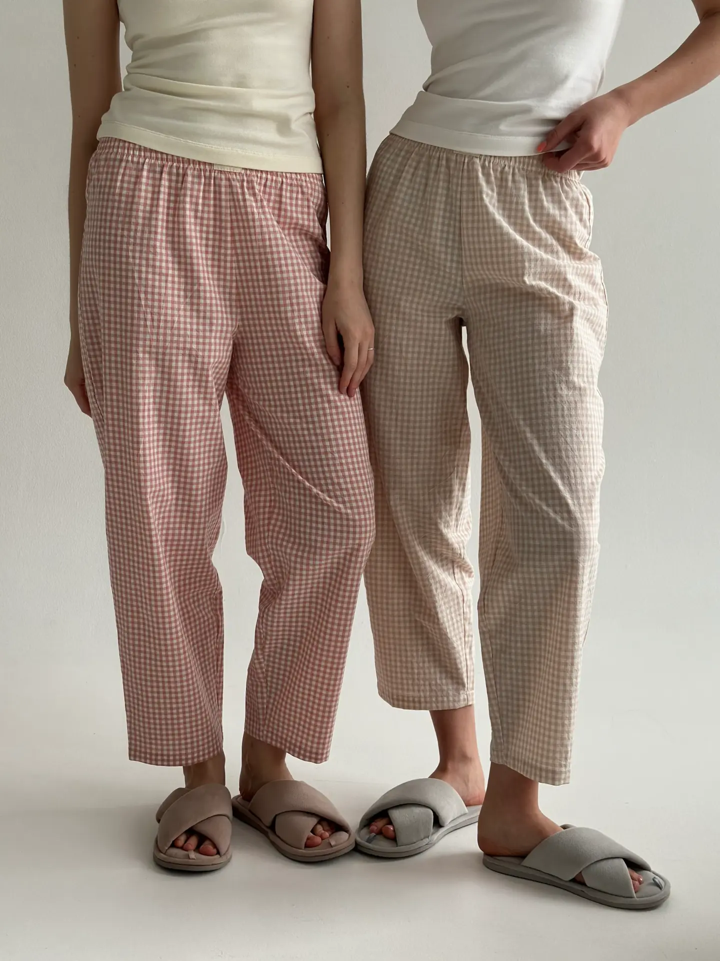 Штани з бавовни в клітинку моделі банани поєднують комфорт і стиль. М’яка натуральна тканина приємна до тіла та добре пропускає повітря, забезпечуючи зручність протягом усього дня. Вільний крій із звуженням донизу створює сучасний силует і робить модель ідеальною як для дому, так і для повсякденних образів.