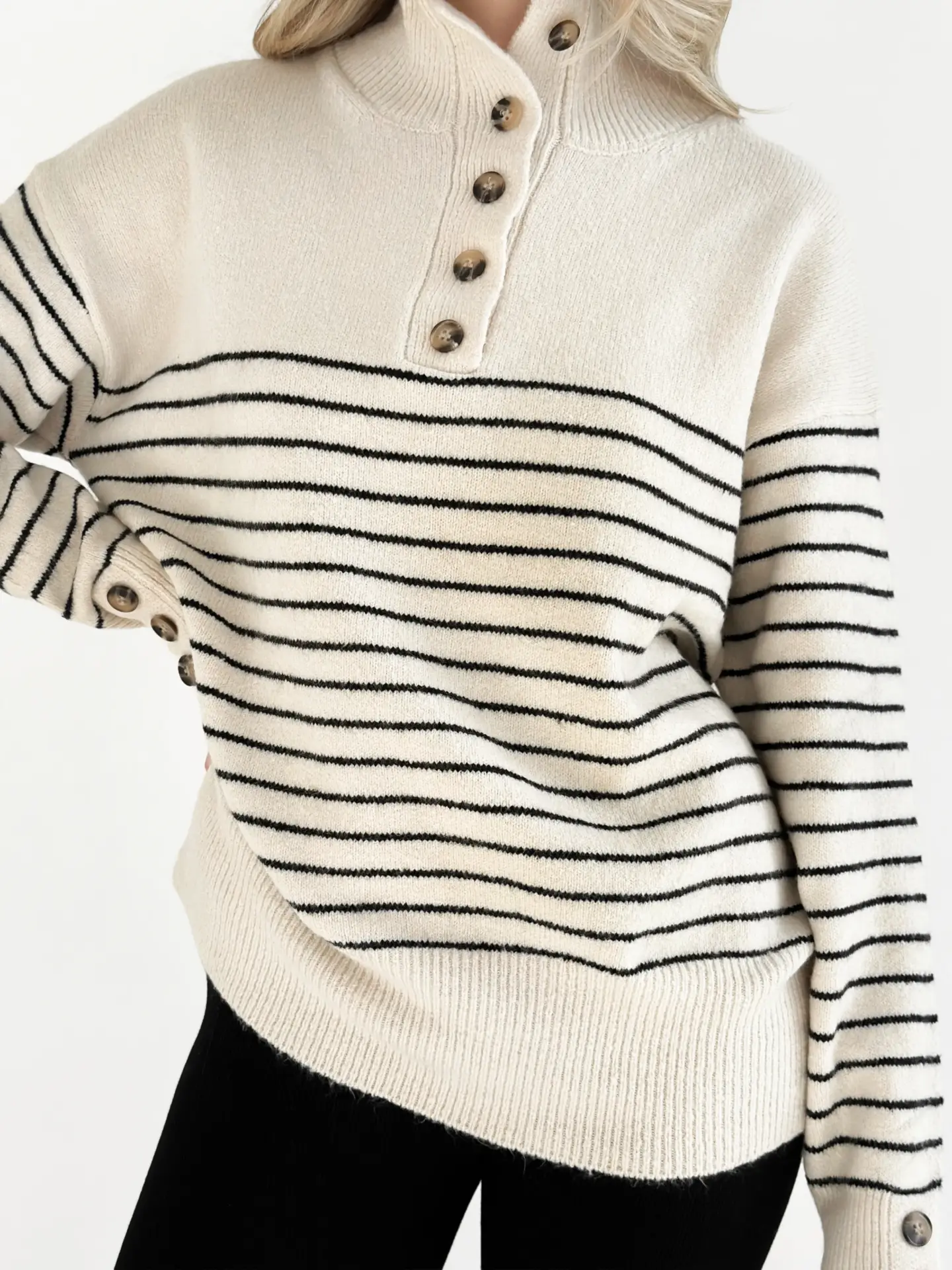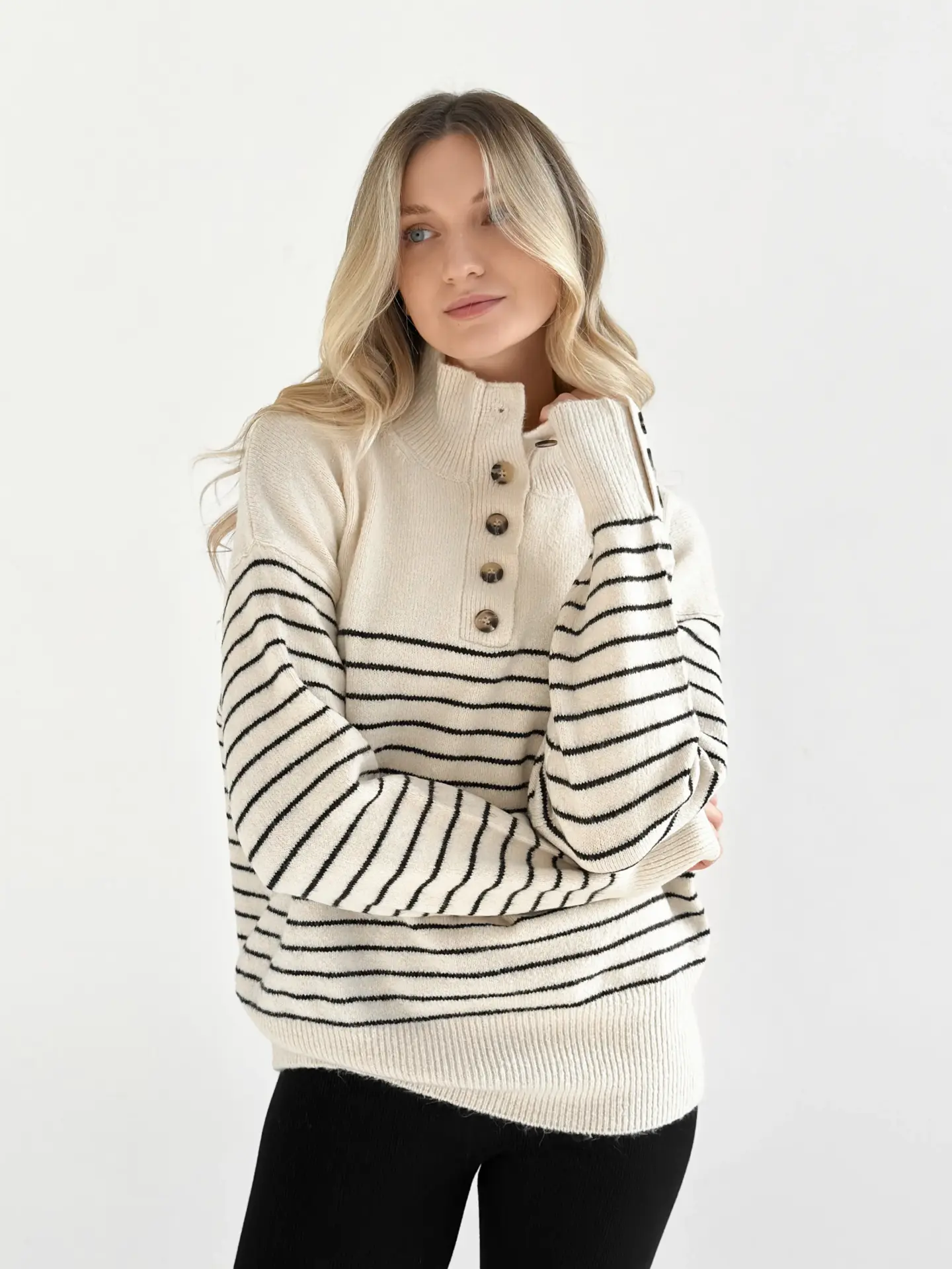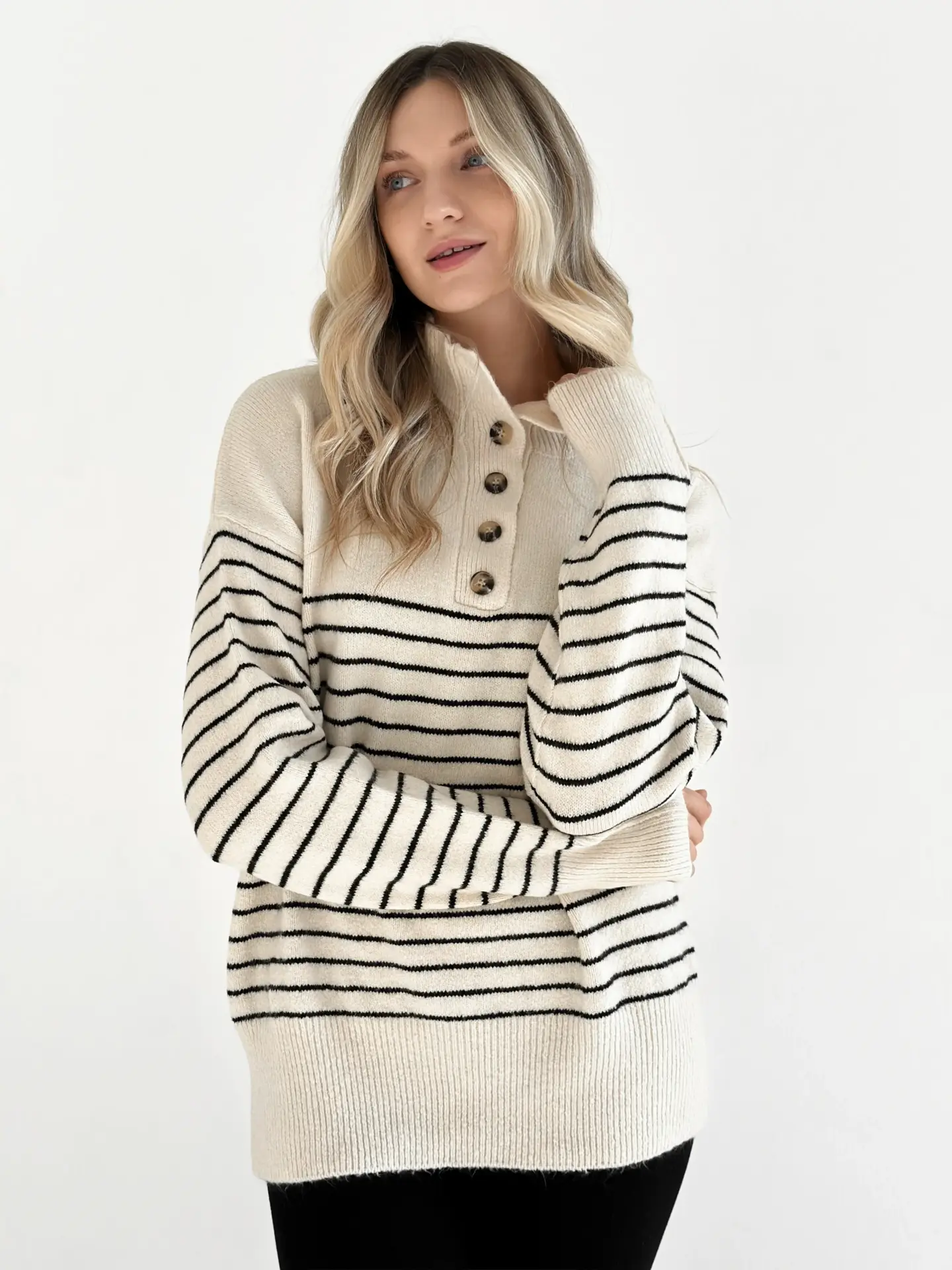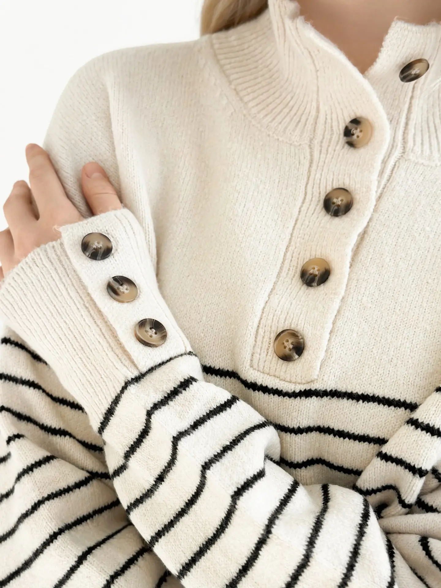 Вовняний светр з коміром у смужку поєднує тепло, комфорт і стиль. М’яка пряжа гарно тримає форму, а смугастий дизайн надає образу трендовості. Ідеальна річ для прохолодних днів і повсякденних затишних луків.