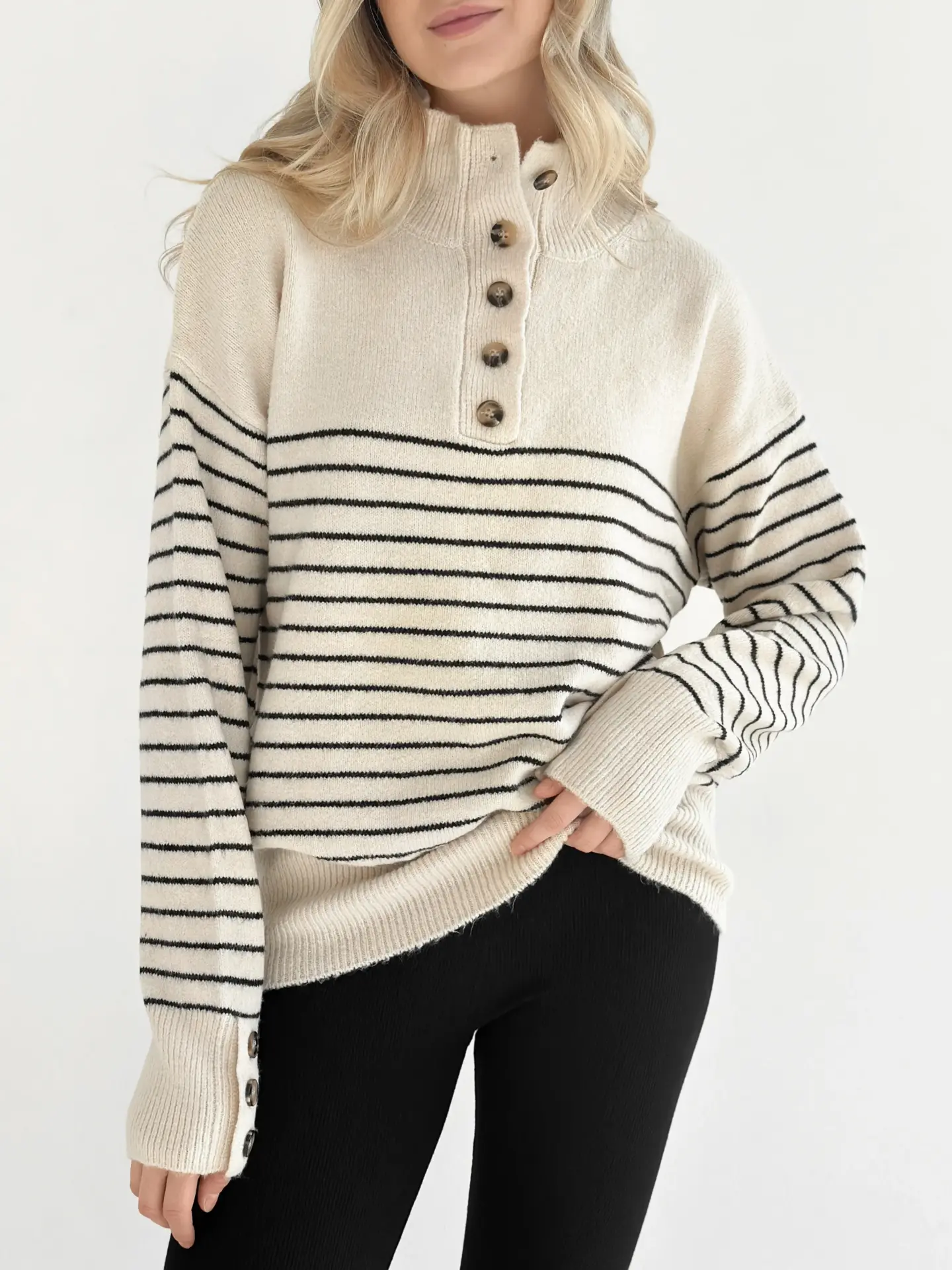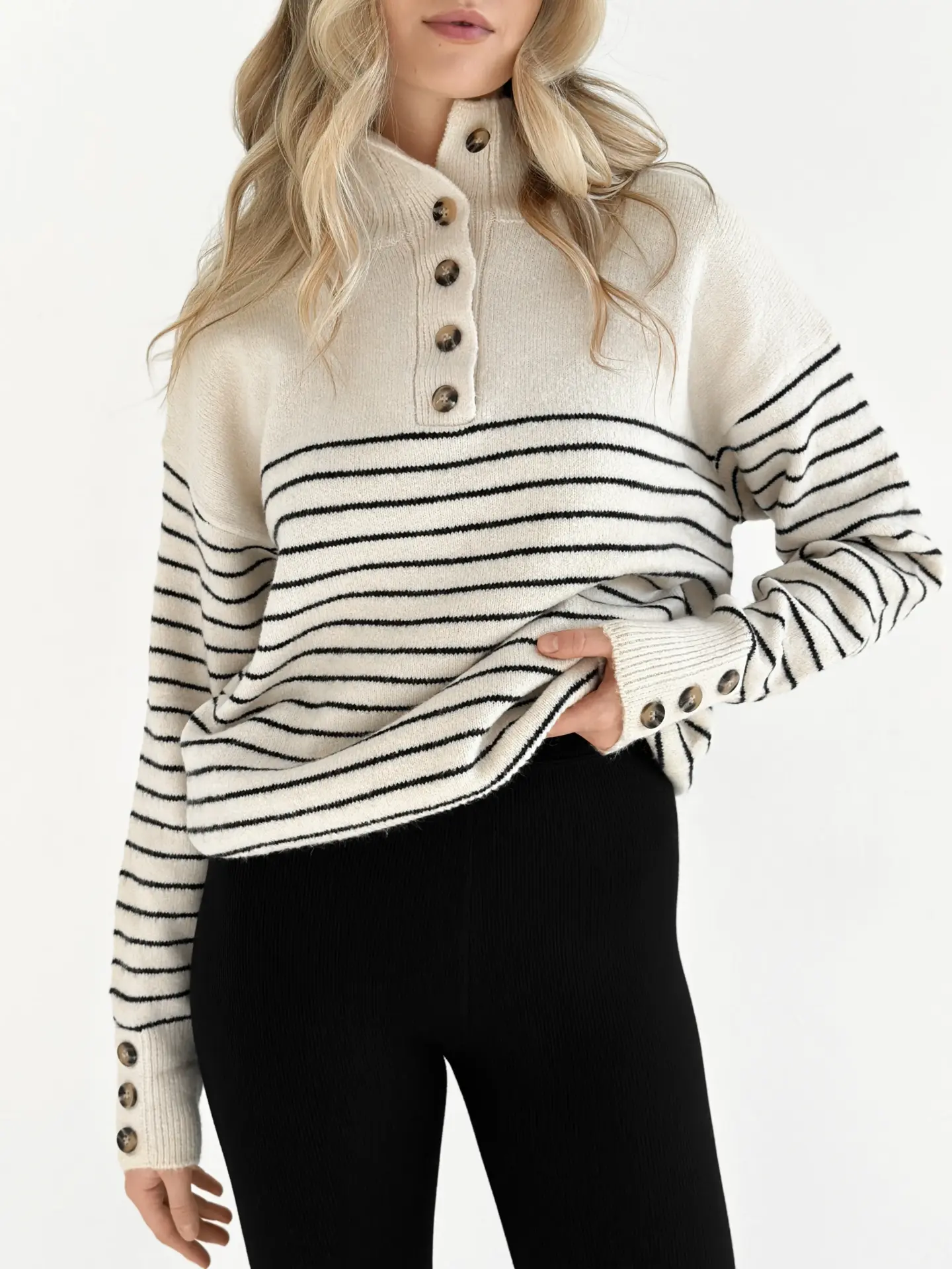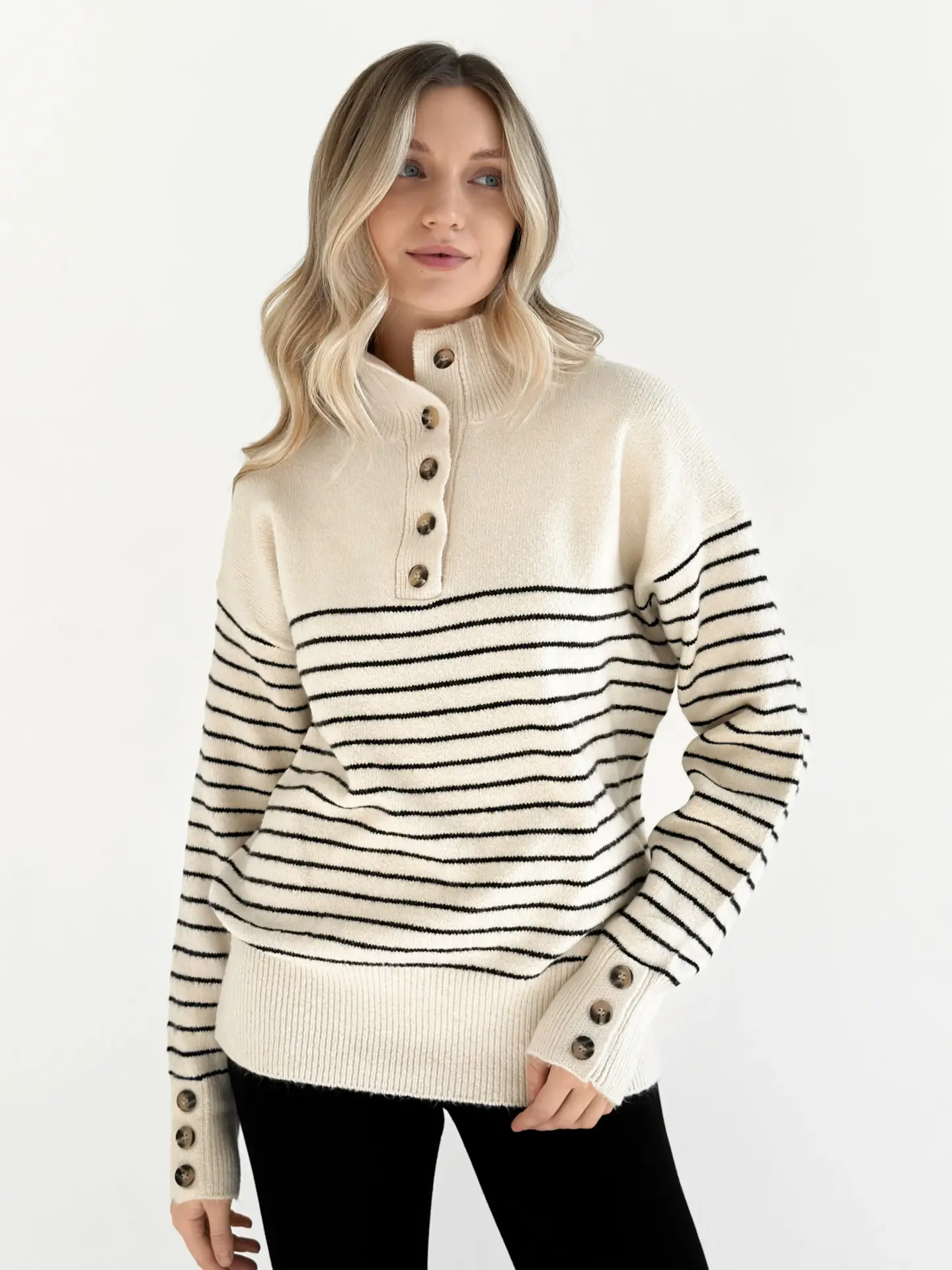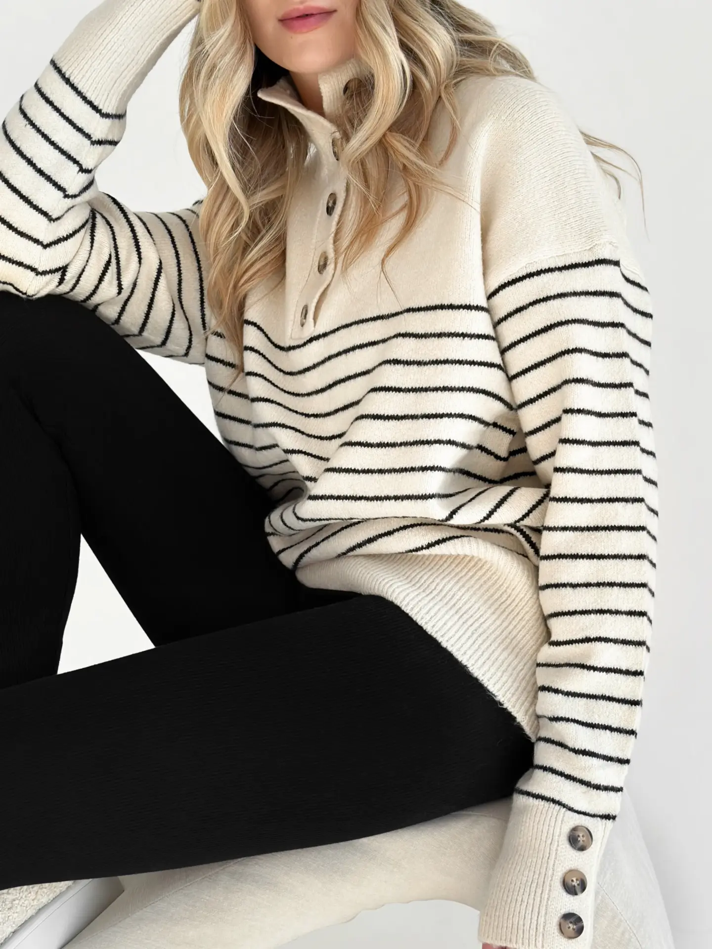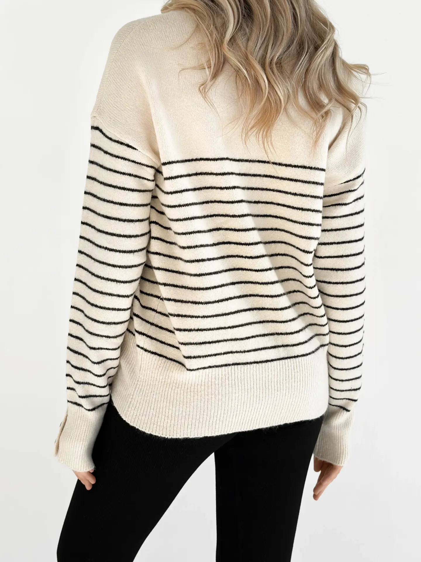 Вовняний светр з коміром у смужку поєднує тепло, комфорт і стиль. М’яка пряжа гарно тримає форму, а смугастий дизайн надає образу трендовості. Ідеальна річ для прохолодних днів і повсякденних затишних луків.