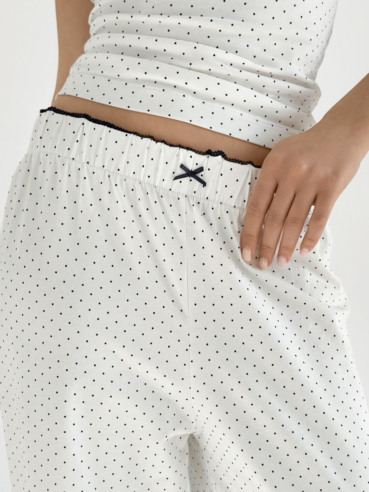 Трикотажний костюм із широкими штанами та майкою у принті синій горох на білому поєднує комфорт і стиль. М’яка тканина приємна до тіла та забезпечує свободу рухів. Підходить для дому і легких літніх образів.