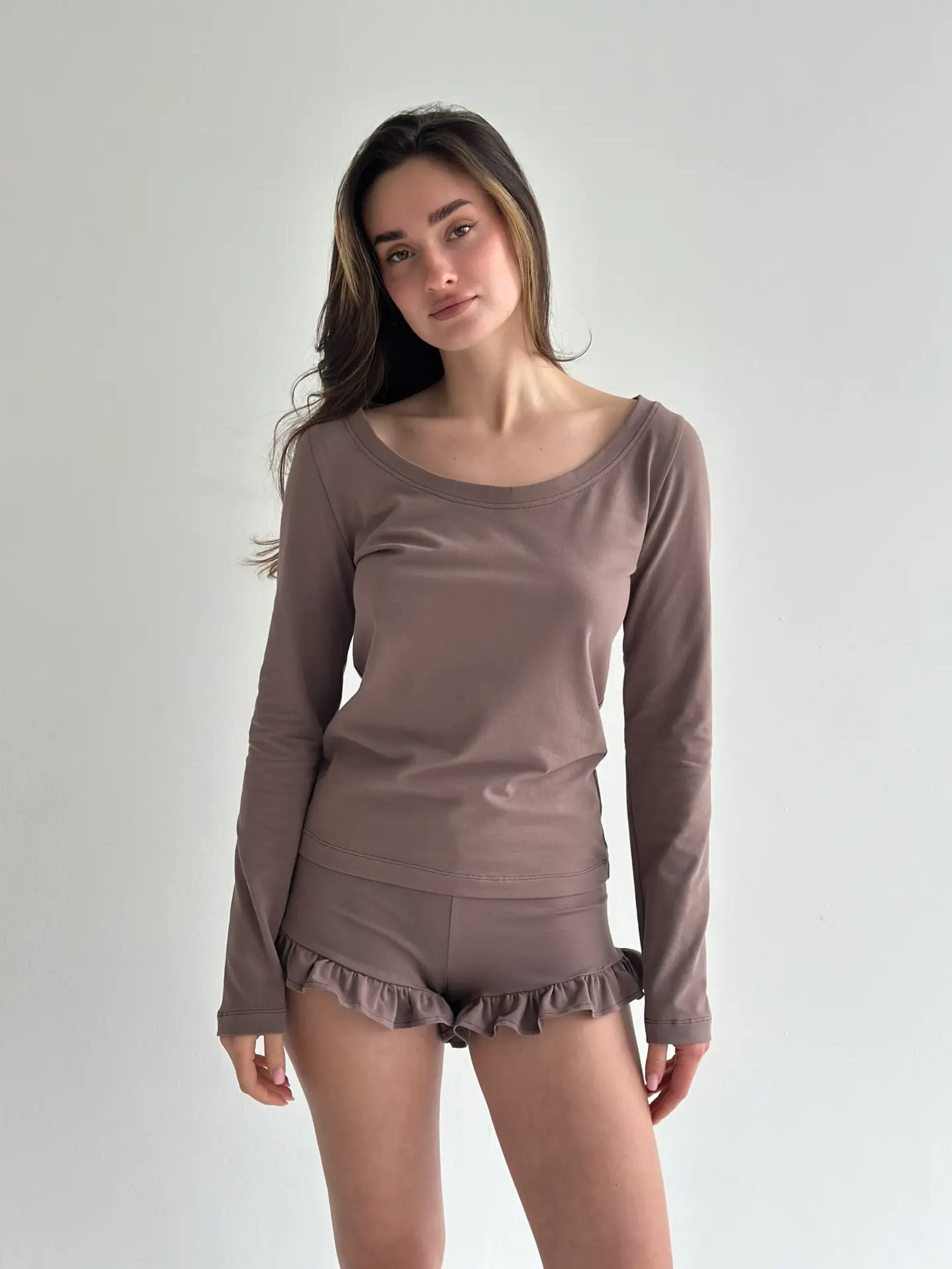 Трикотаж Кулір комплект лонгслів та шорти з рюшами шоколад - Twins