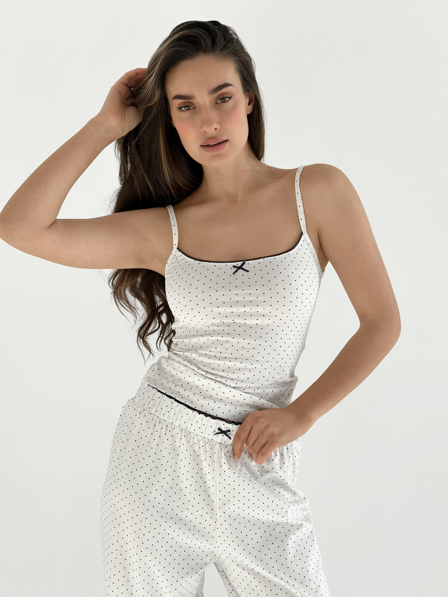 Майка на бретелях із трикотажу. Легка та еластична, забезпечує комфорт і свободу рухів. Ідеально підходить для базового гардероба або домашнього затишку.