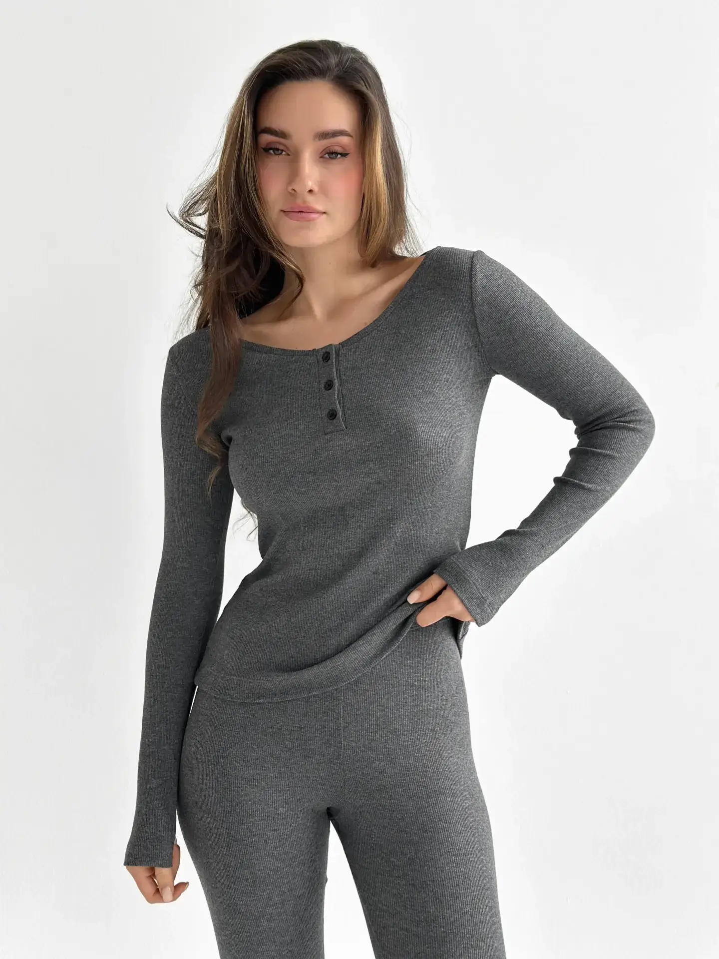-40%Трикотаж рубчик Лонгслів антрацит (без гудзика)