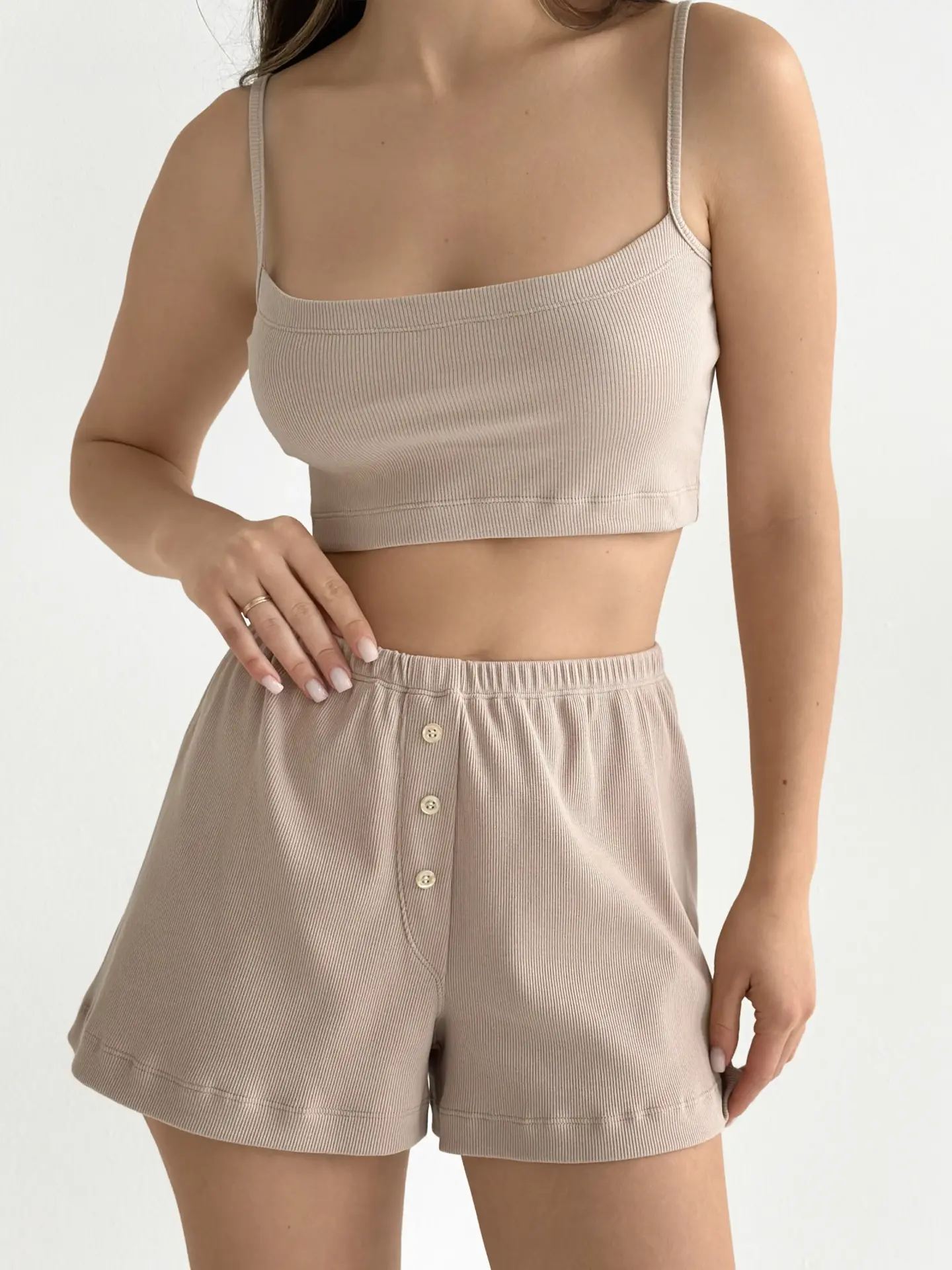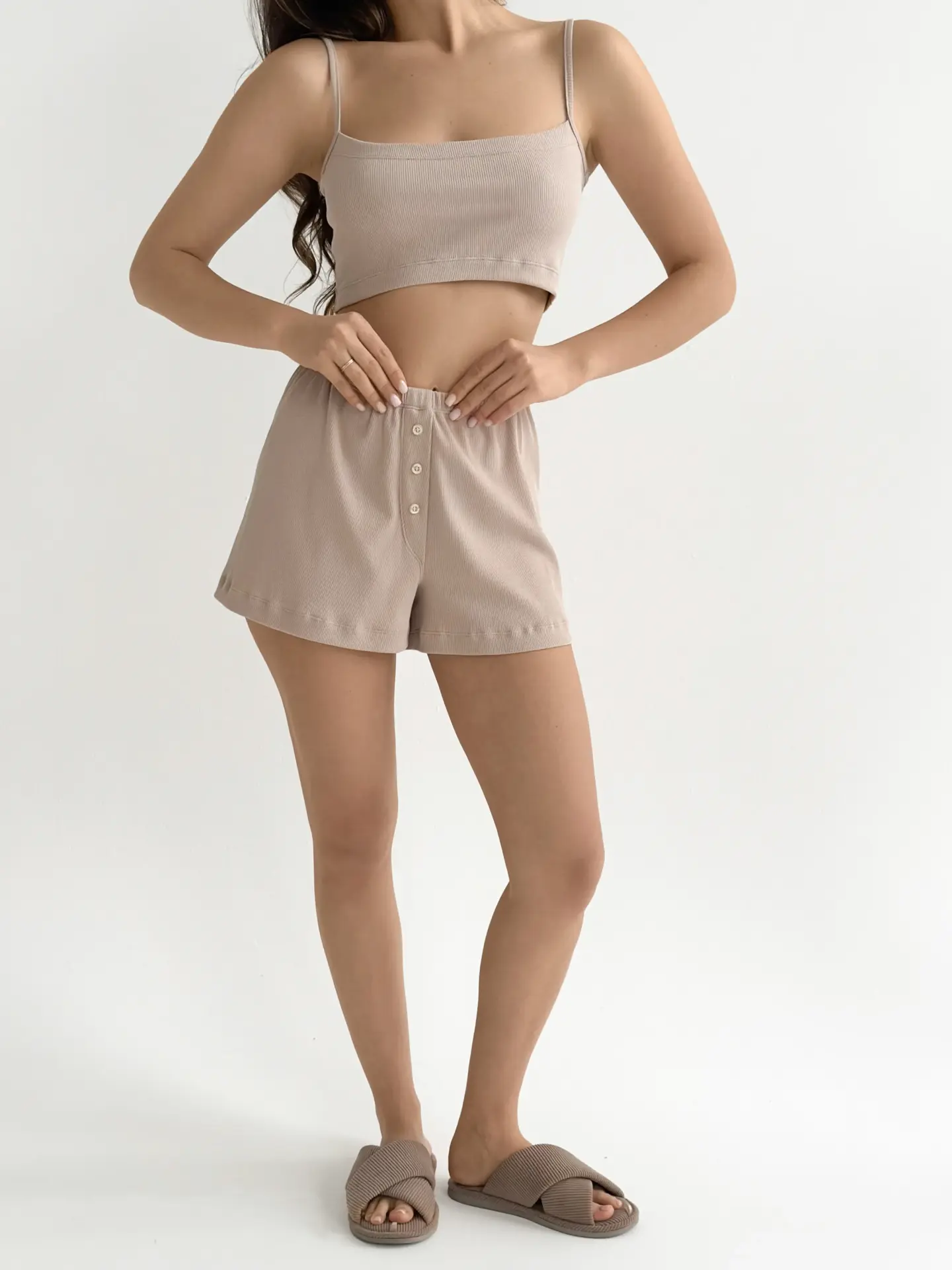 Шорти з гульфіком із трикотажу рубчик поєднують комфорт і практичність. М’яка еластична тканина забезпечує зручність у носінні та свободу рухів. Лаконічний дизайн робить їх універсальним вибором для дому та відпочинку.