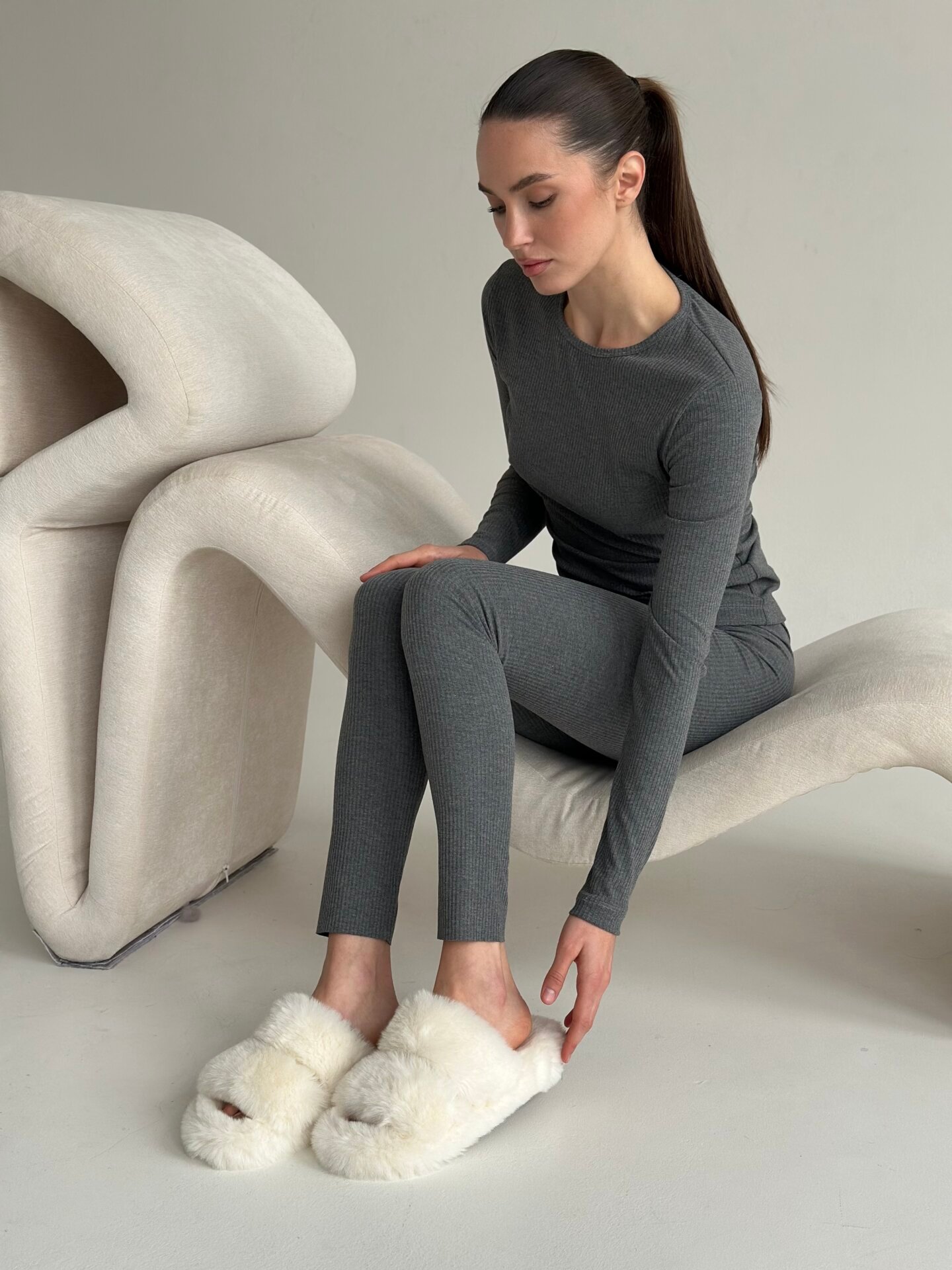 Костюм із широкого трикотажного рубчика лонгслів та лосини створений для максимального комфорту та щоденної зручності. М’яка еластична тканина приємно прилягає до тіла, забезпечуючи свободу рухів. Лонгслів має лаконічний крій, а лосини м’яко підкреслюють силует. Ідеальний варіант для домашнього затишку та повсякденних образів.