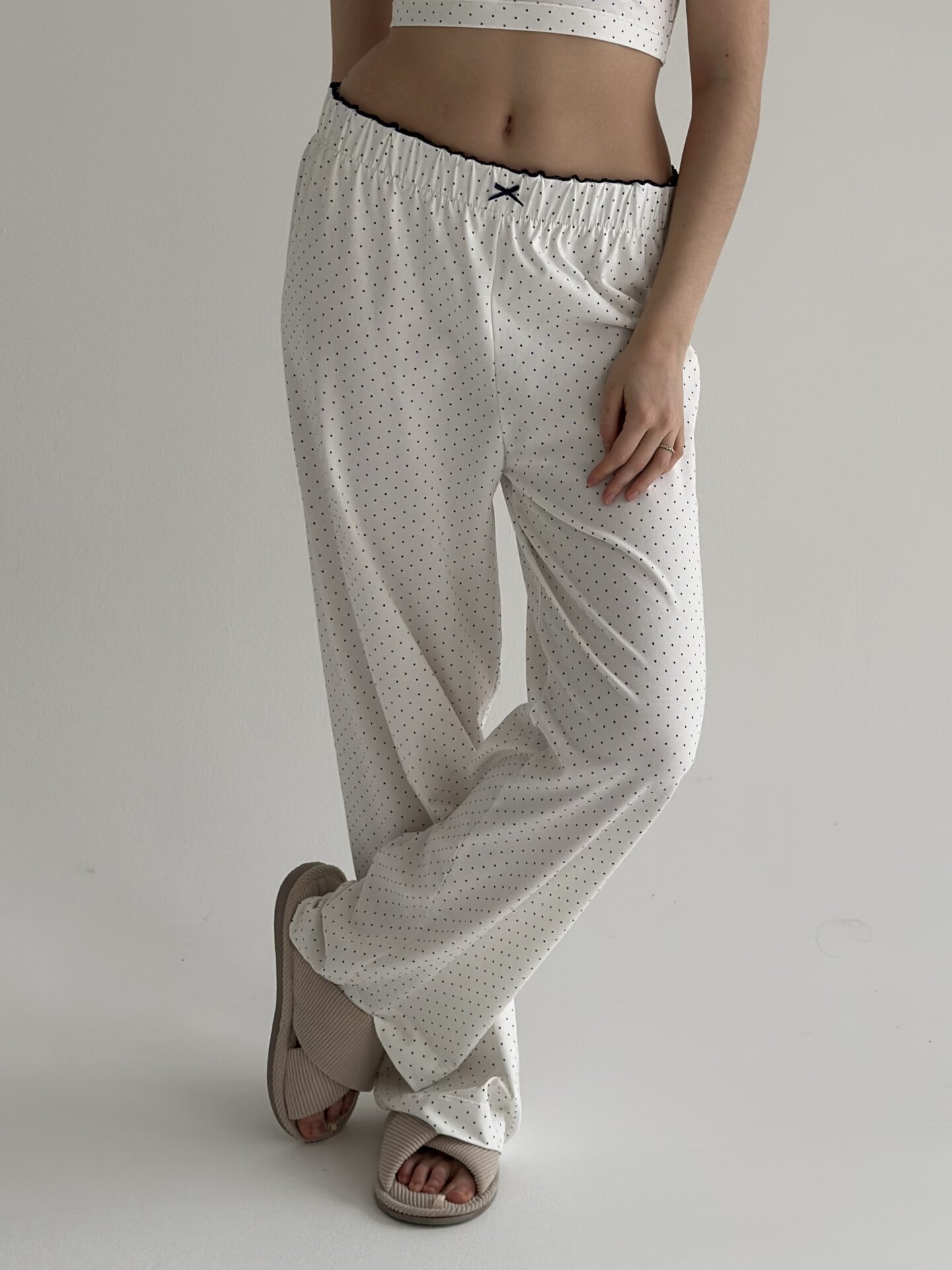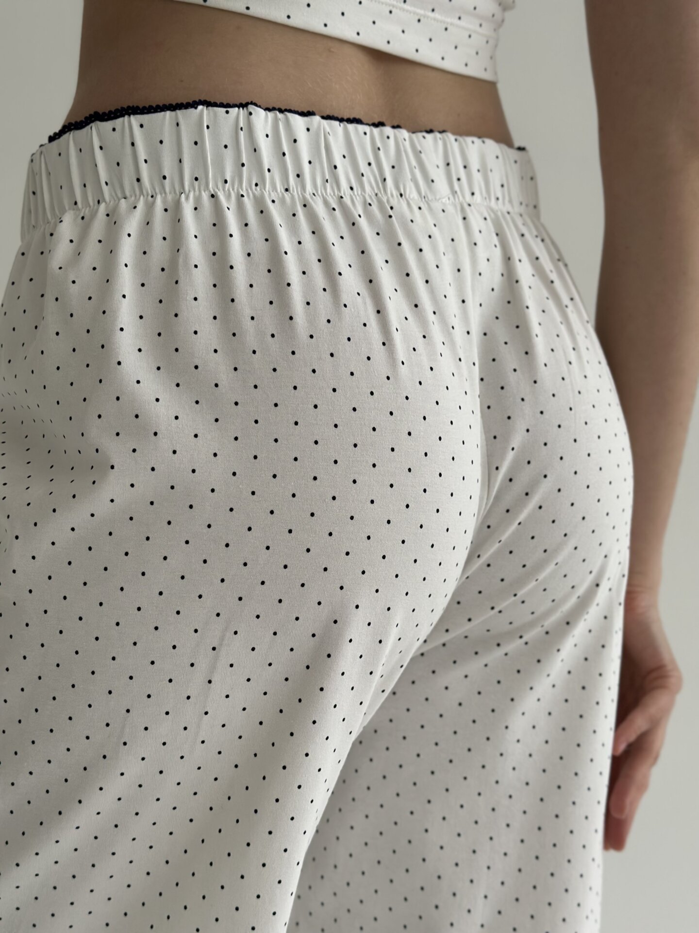 Трикотаж штани широкі горох синій на білому