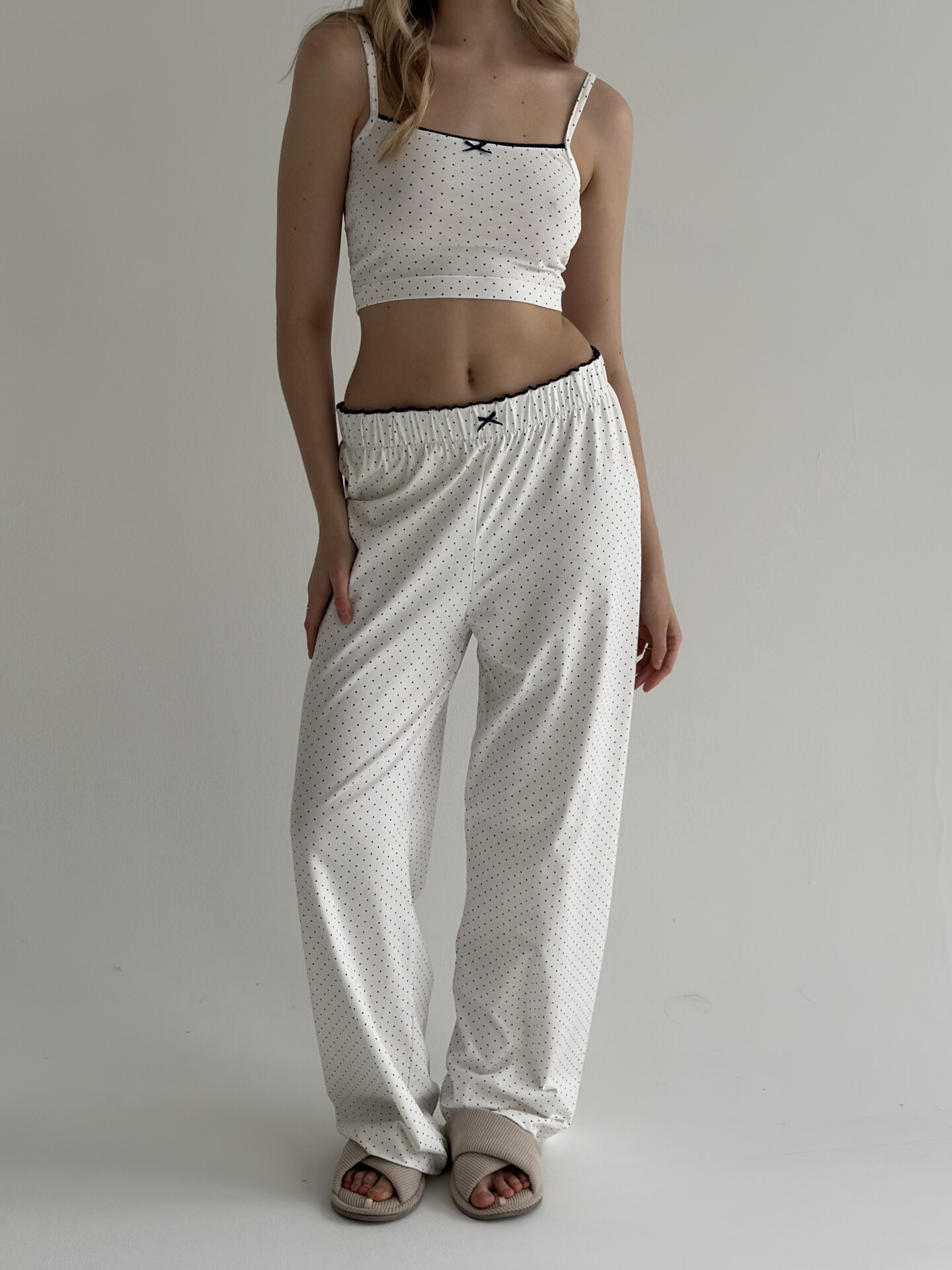 Трикотаж костюм штани широкі та майка горох синій на білому