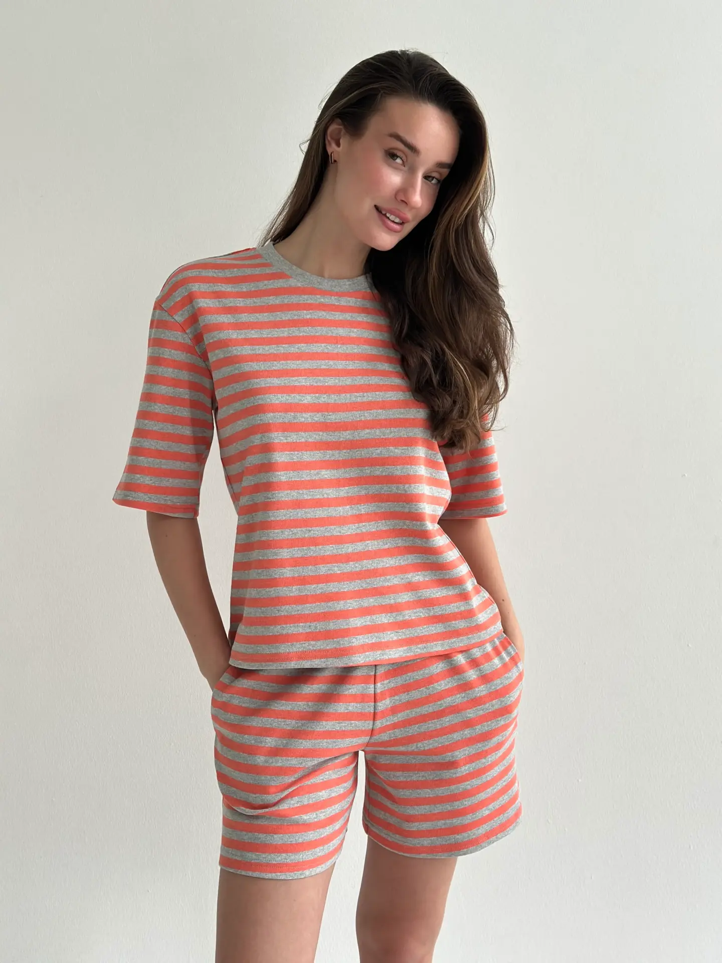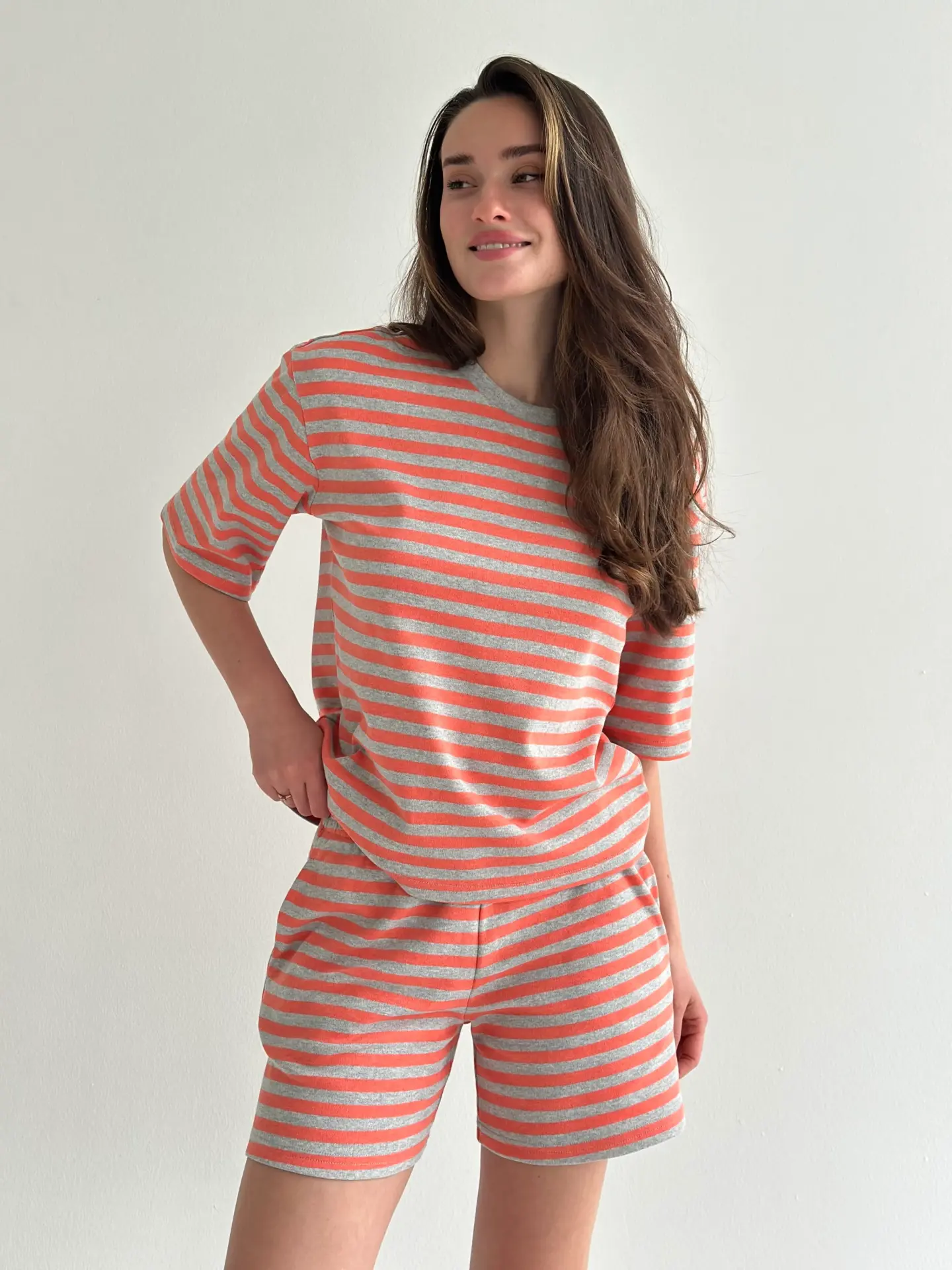 Костюм футболка та шорти з трикотажу в смужку поєднує комфорт і лаконічний стиль. М’яка трикотажна тканина приємна до тіла, добре тягнеться та забезпечує зручність протягом усього дня. Футболка та зручні шорти створюють практичний комплект, що ідеально підходить для домашнього відпочинку.