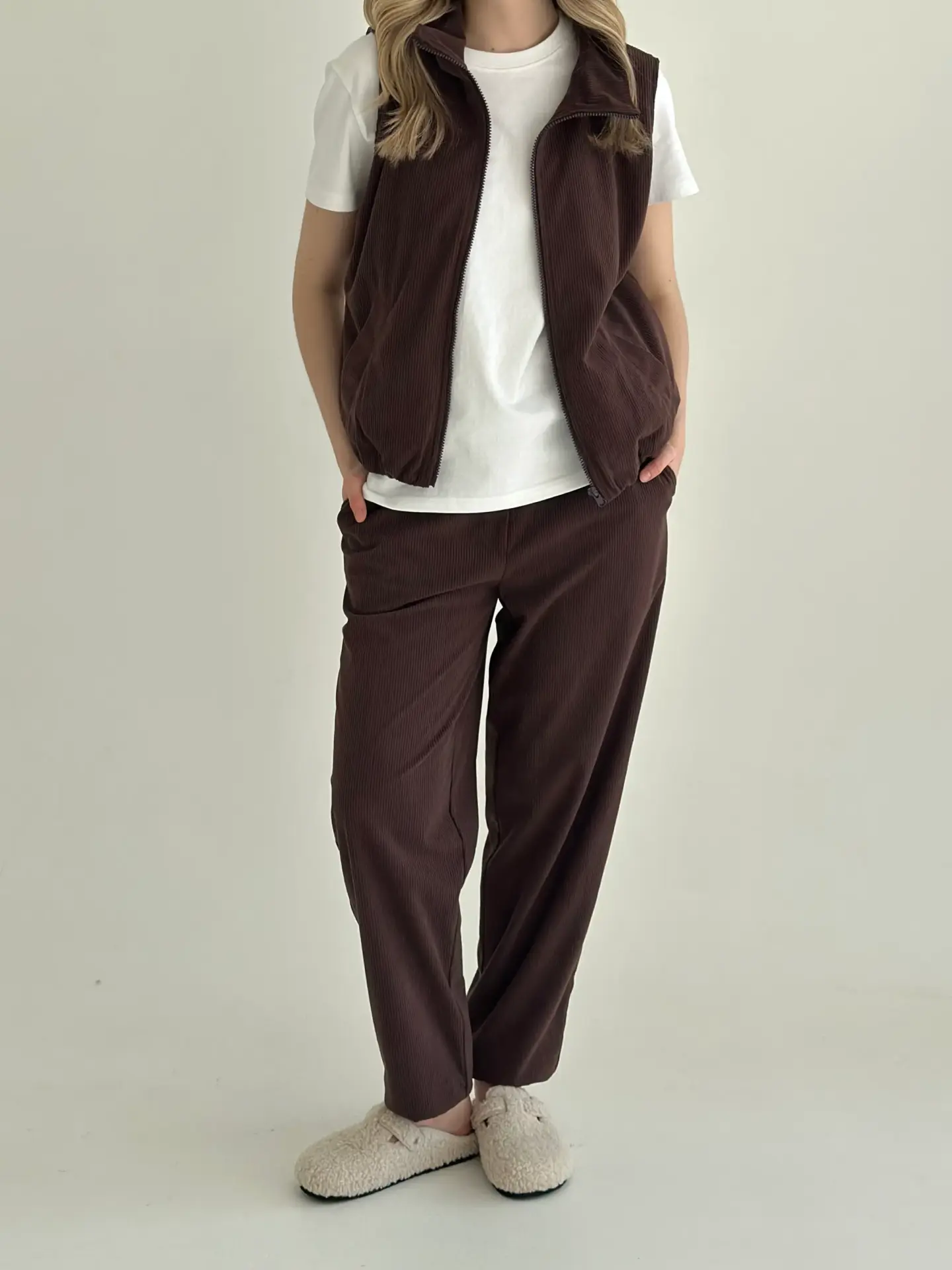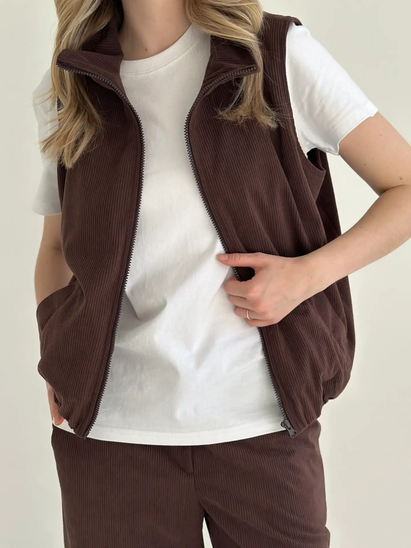 Вельветовий жилет виглядає стильно й акуратно. М’яка фактурна тканина приємна на дотик і додає образу затишку. Легко поєднується з сорочками, лонгслівами чи футболками та гарно доповнює повсякденний гардероб.