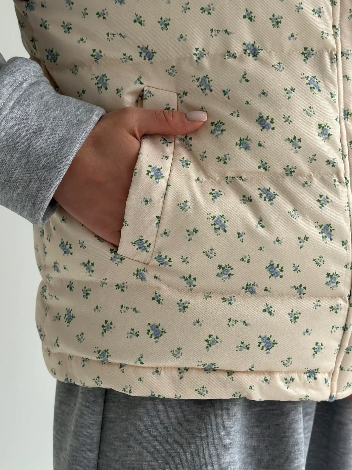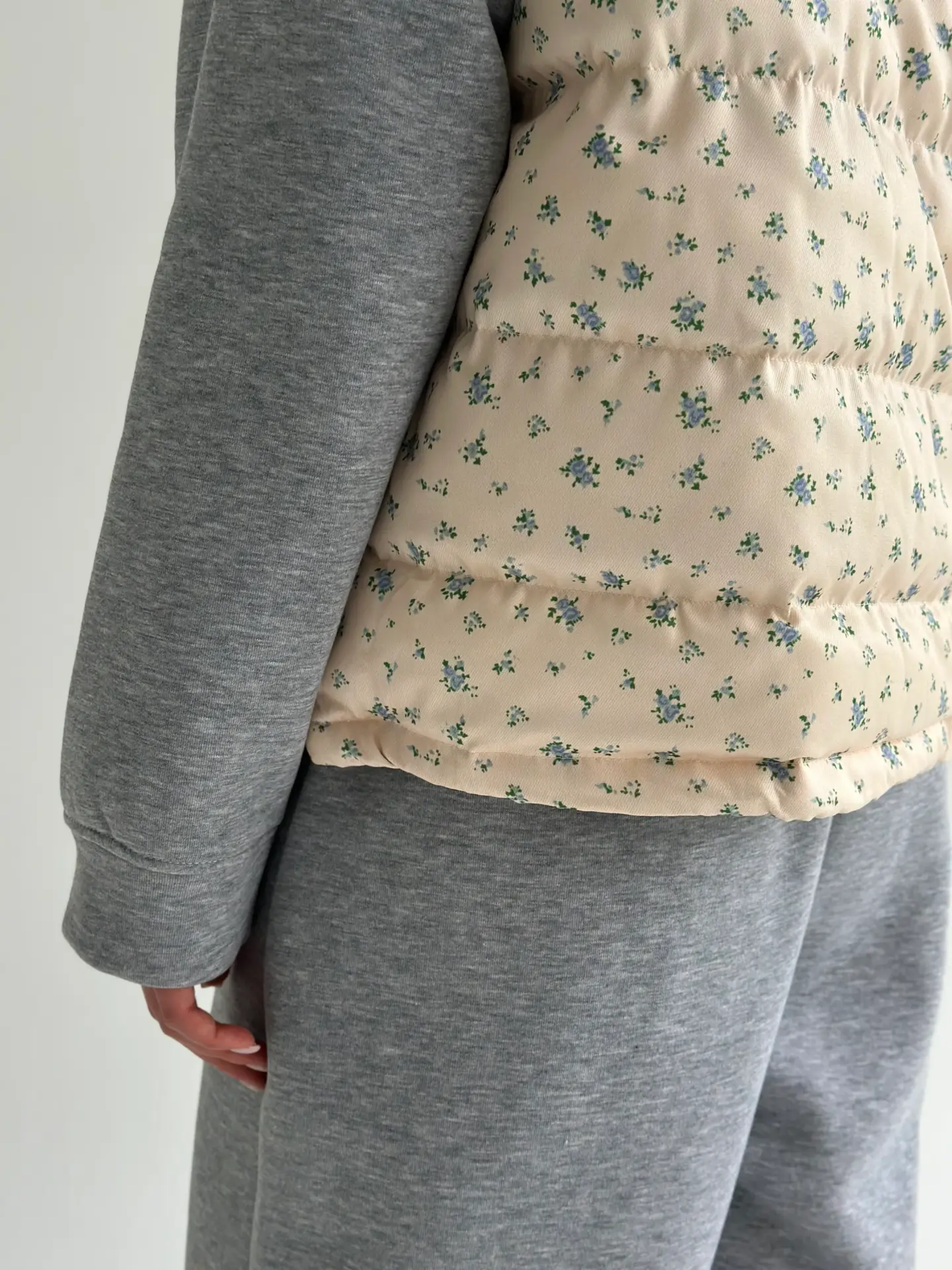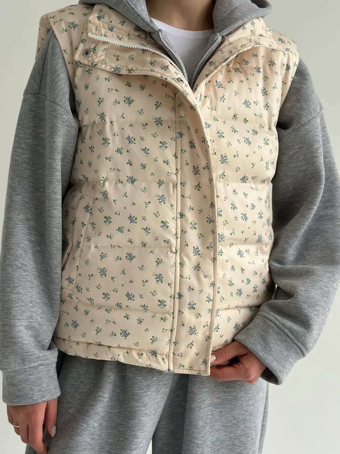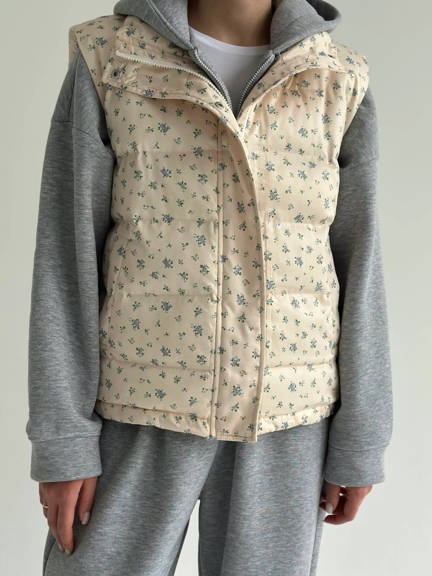 Жилетка стьобана дута молочна у блакитну квітку