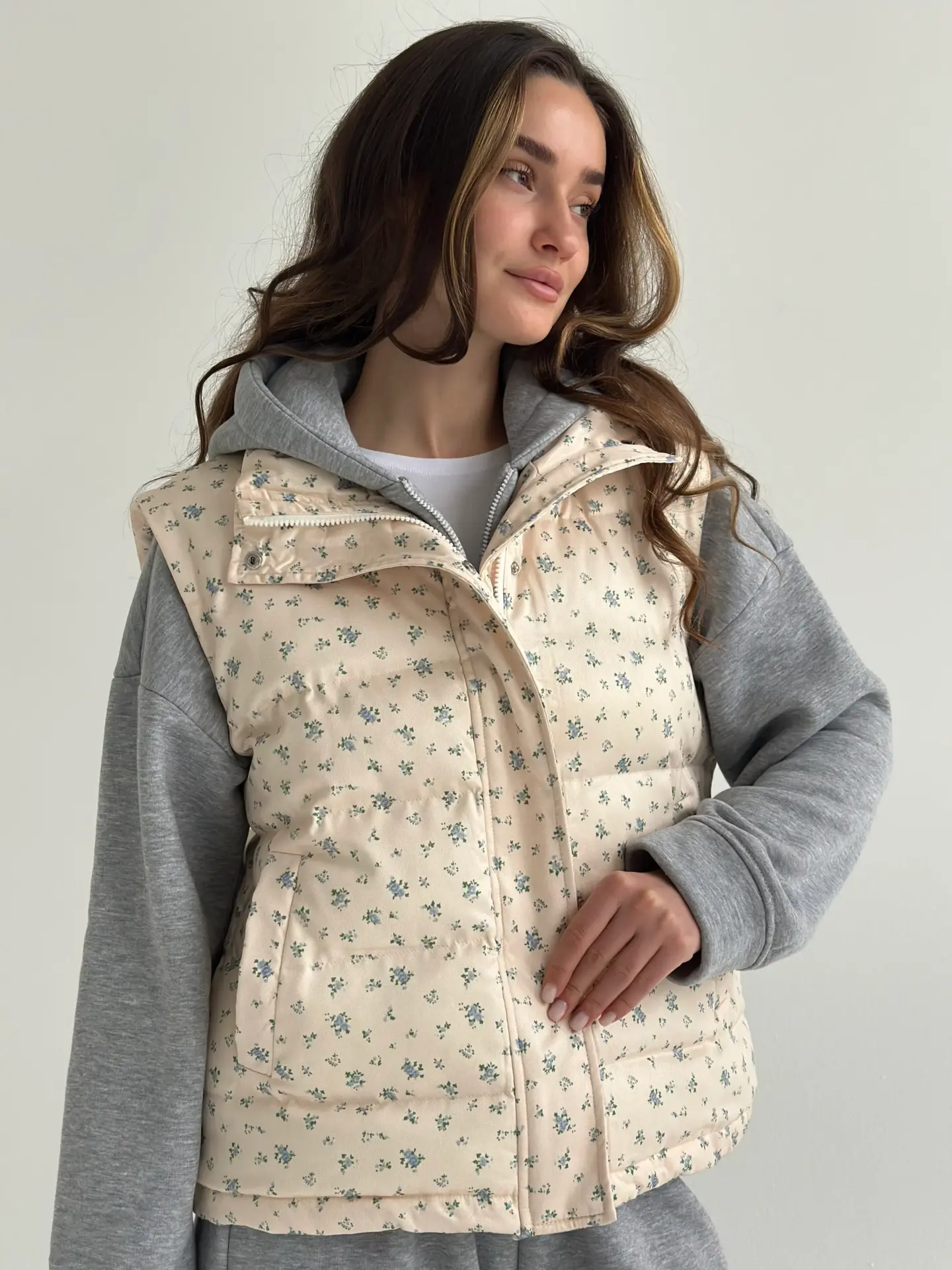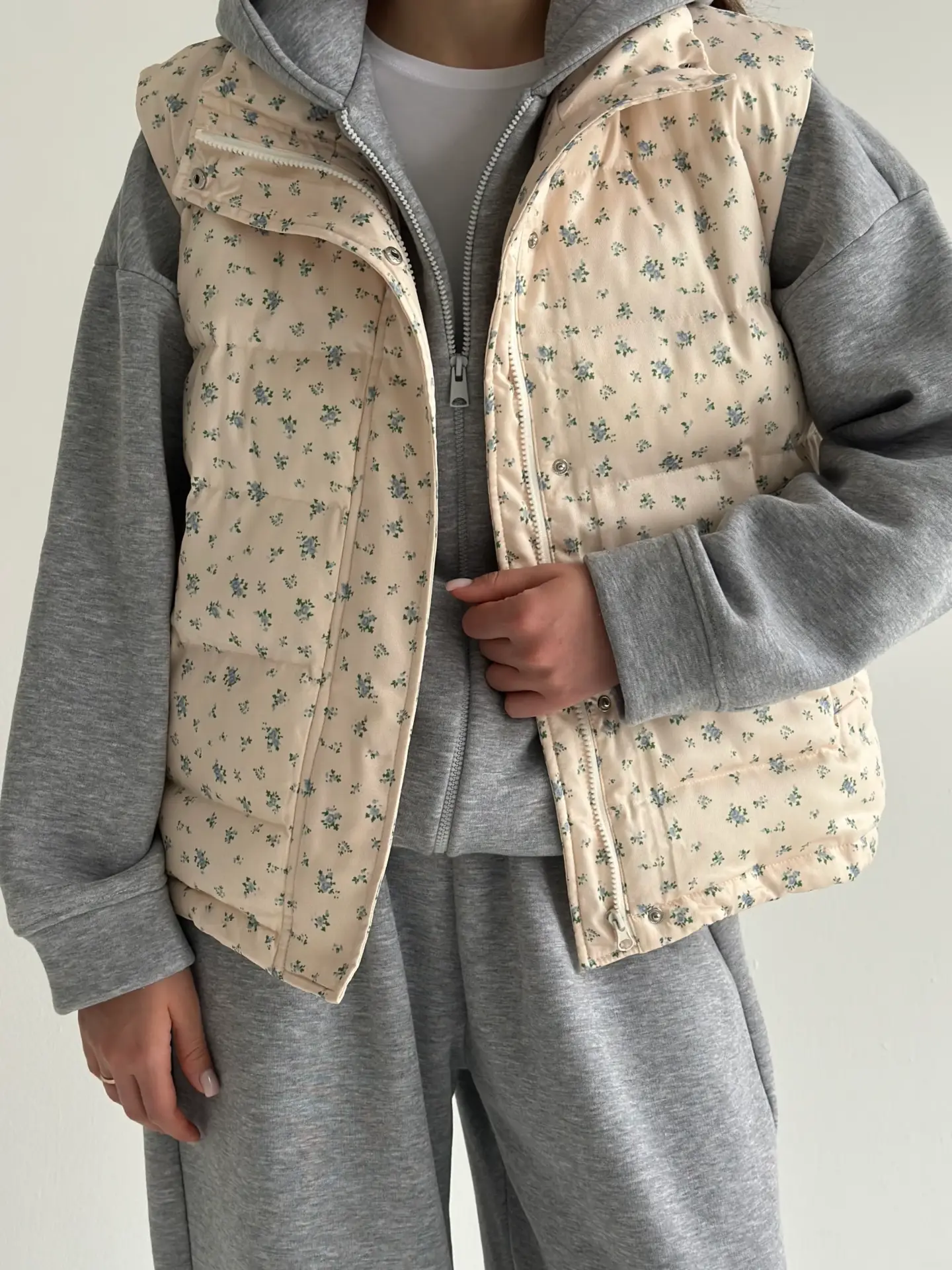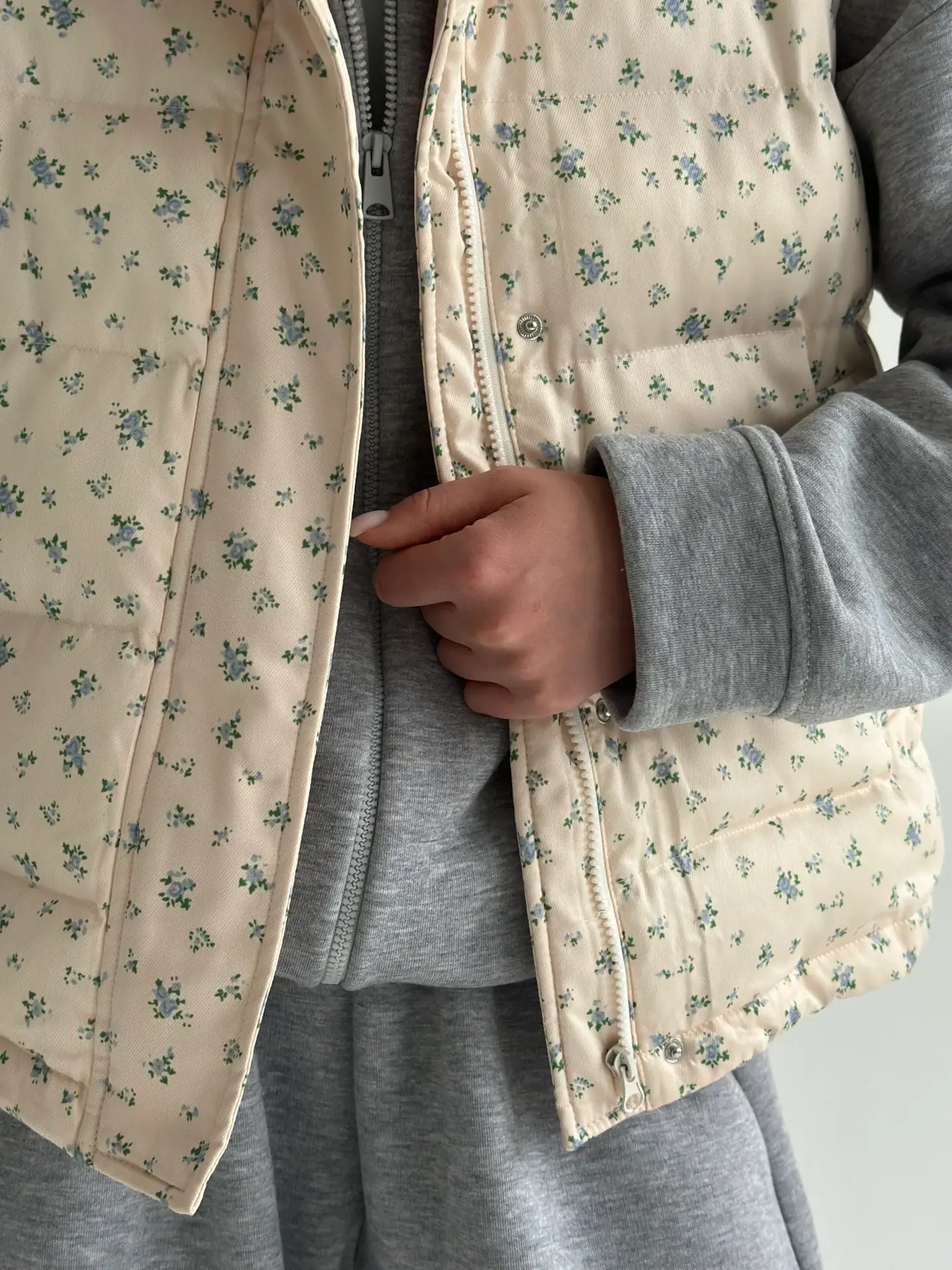 Жилетка стьобана дута молочна у блакитну квітку