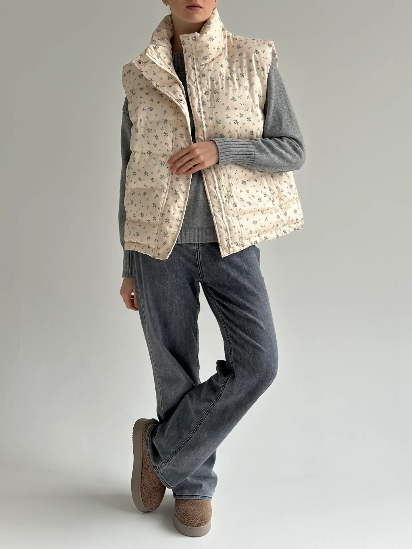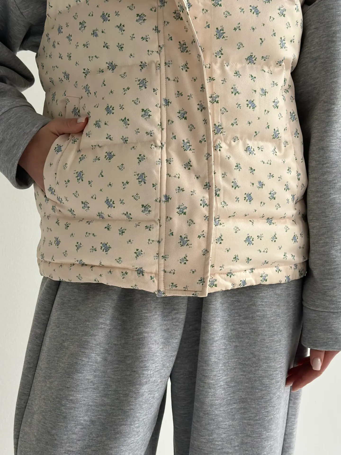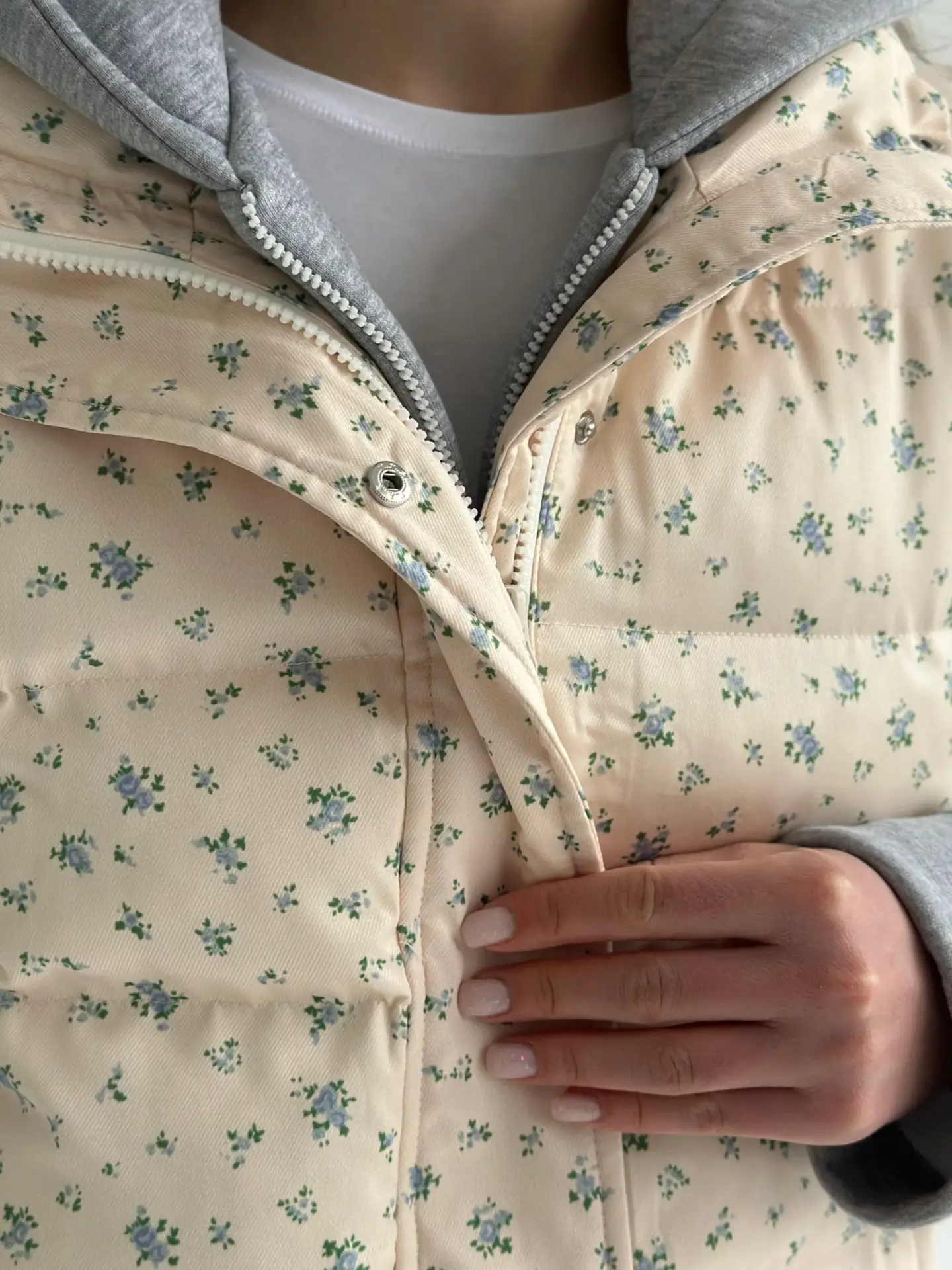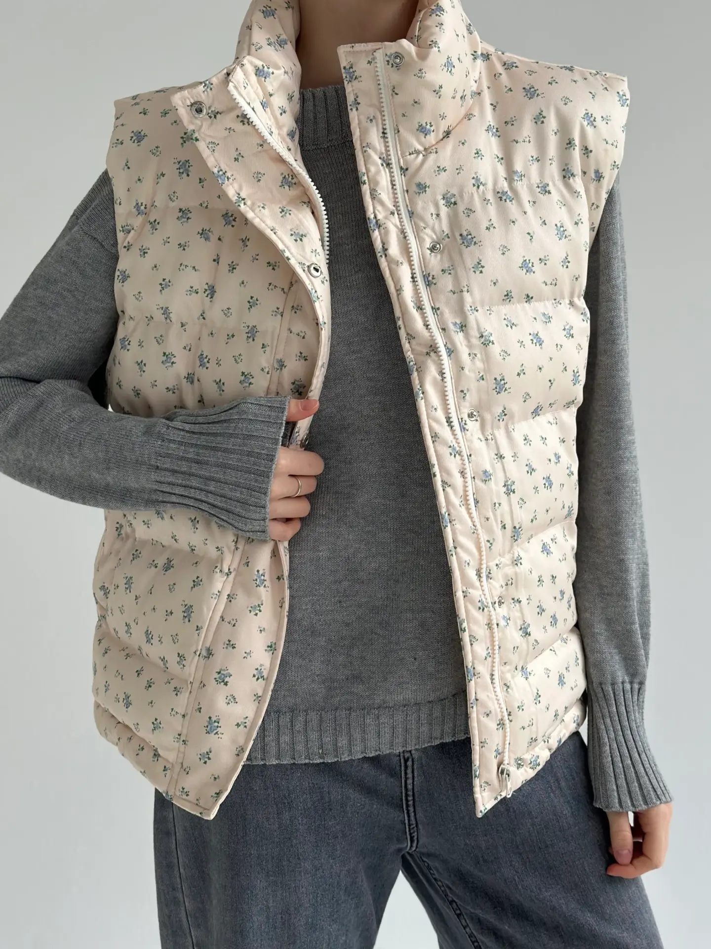 Жилетка стьобана дута молочна у блакитну квітку